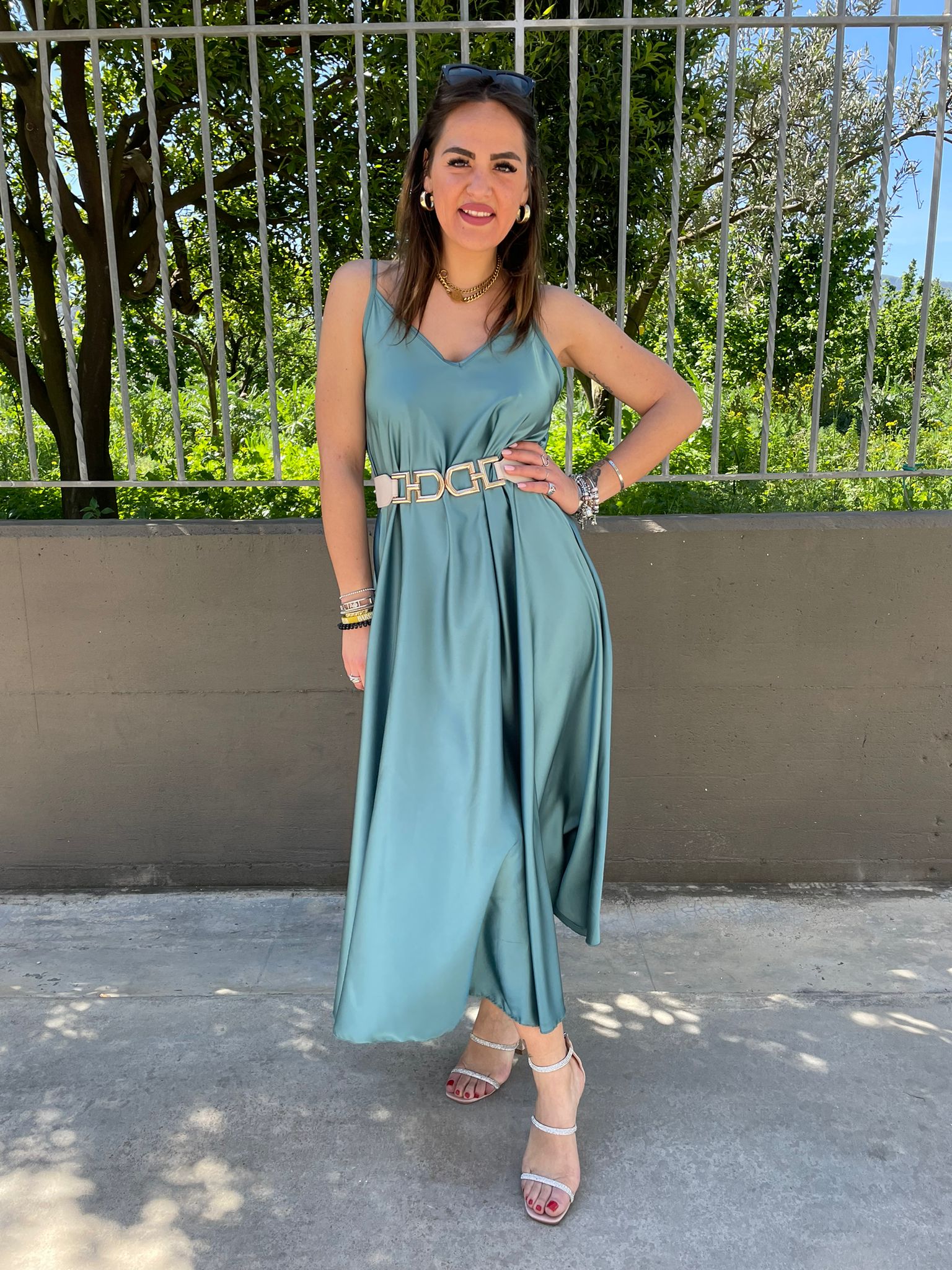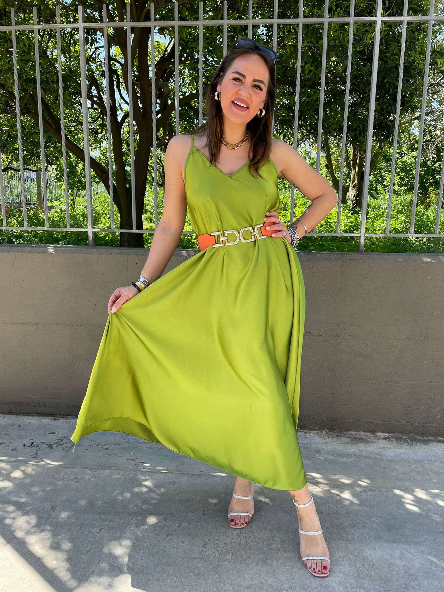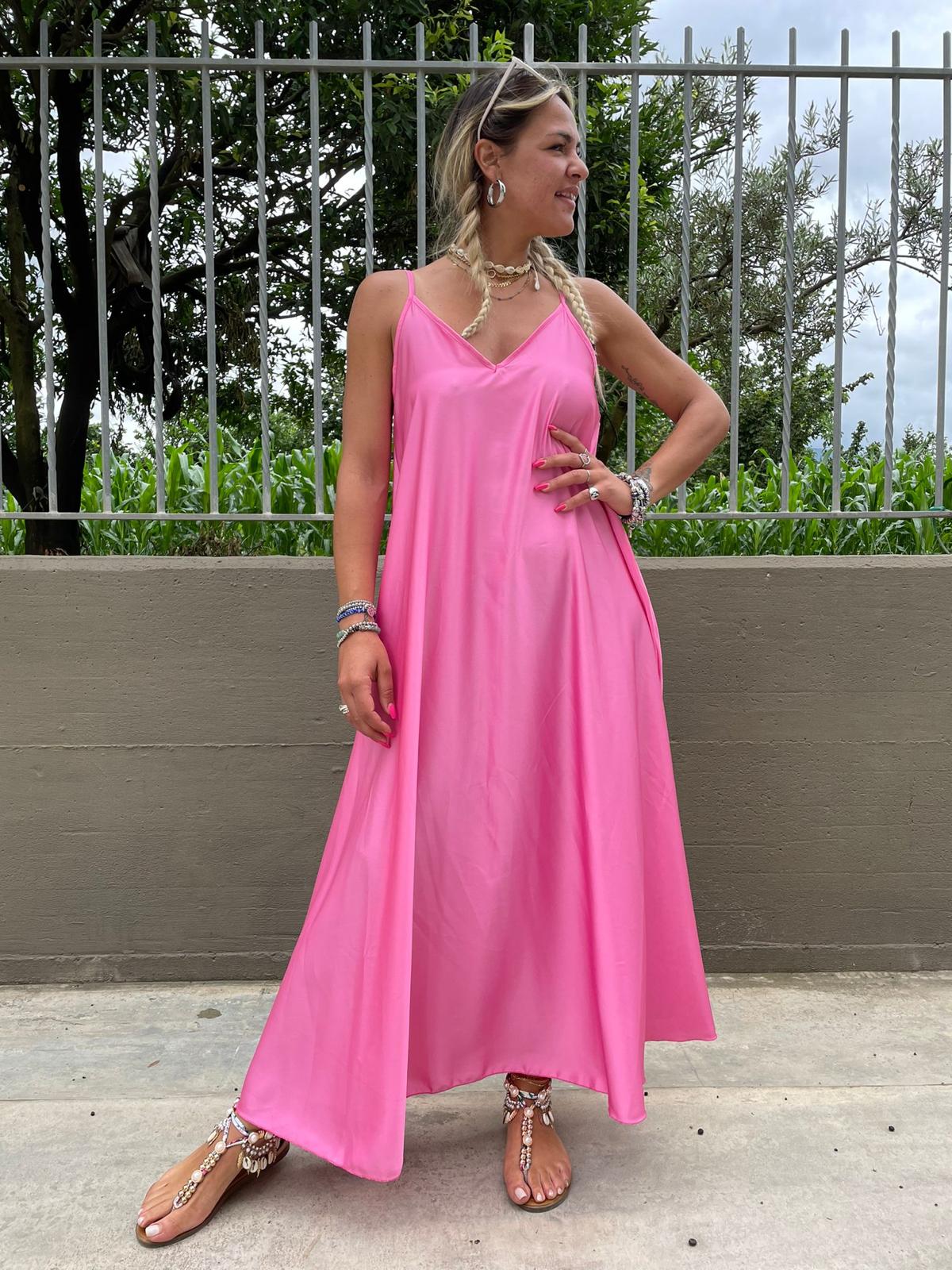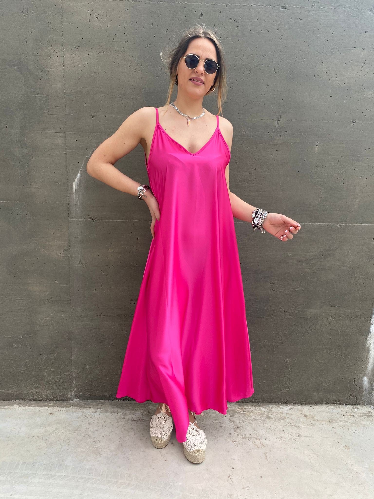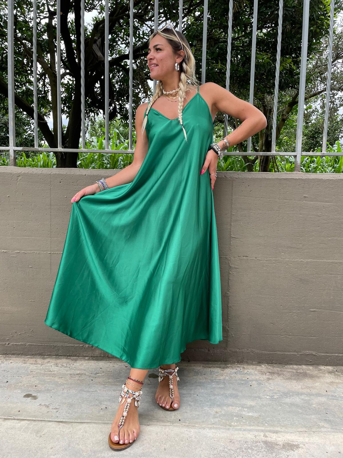 vestito lungo, effetto seta, modello semplice, scollato dietro, disponibile in diversi colori, taglia unica, veste tranquillamente fino ad unta taglia "L", la modella è alta 1.79