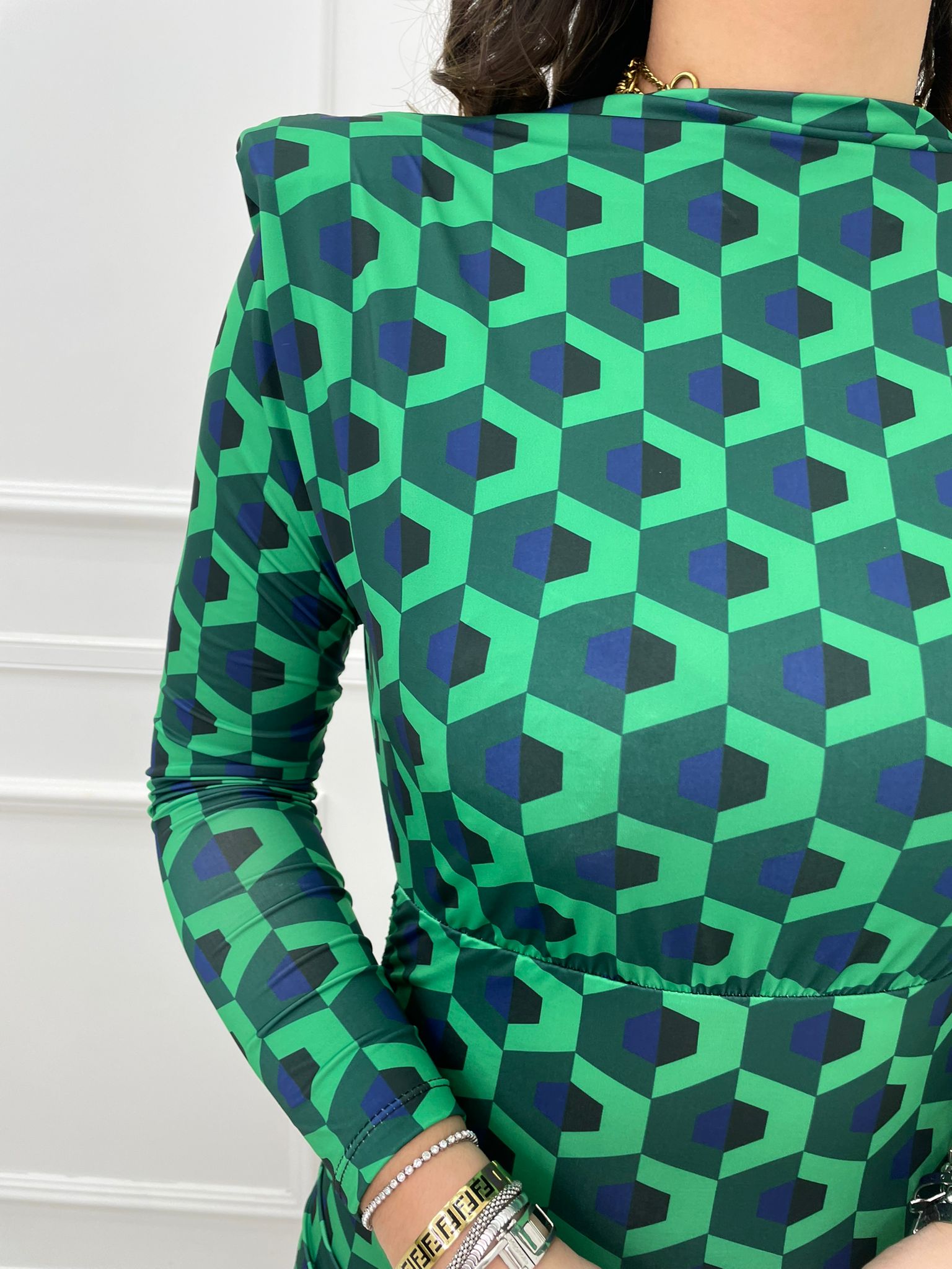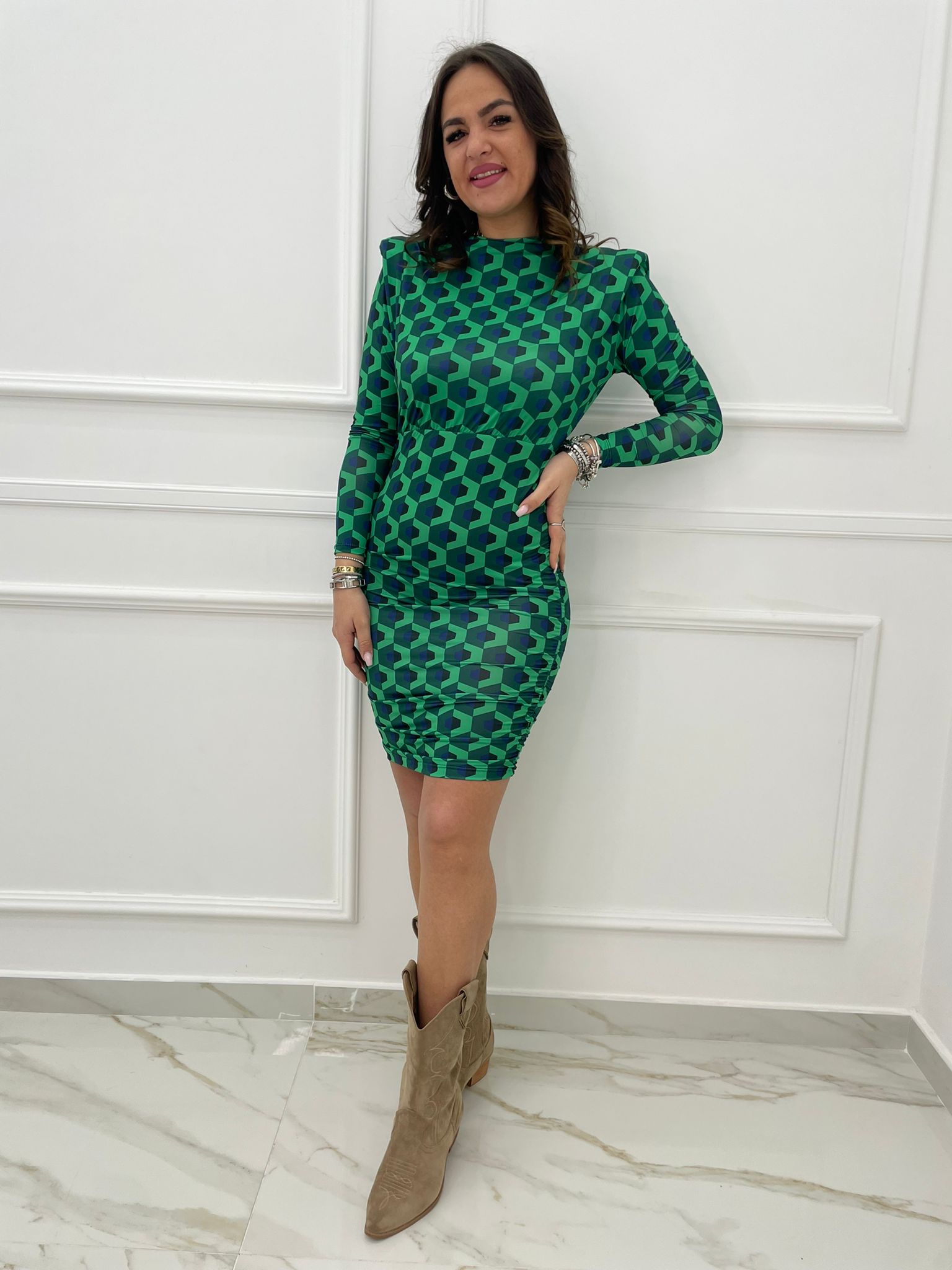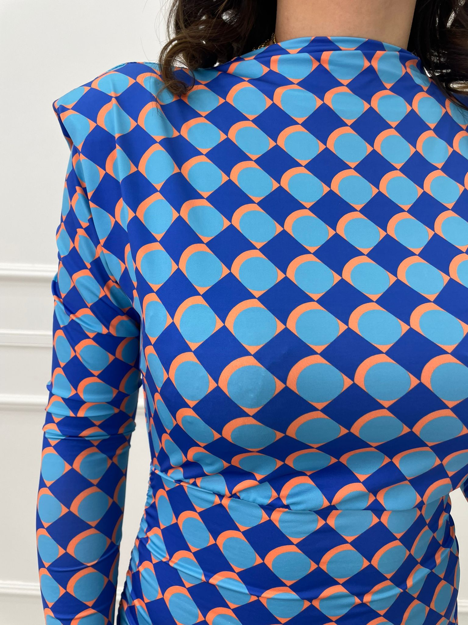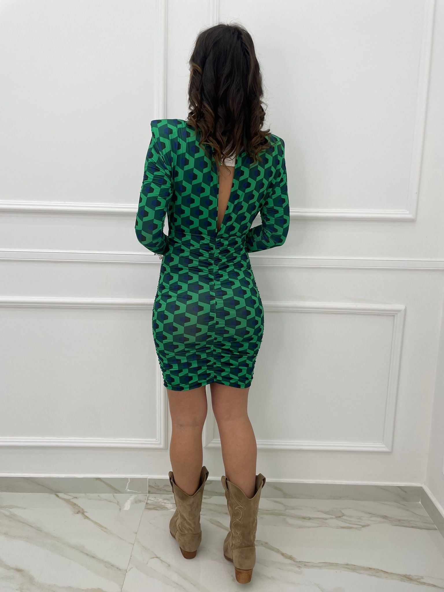 Vestitino fantasia geometrica con drappeggio e apertura dietro