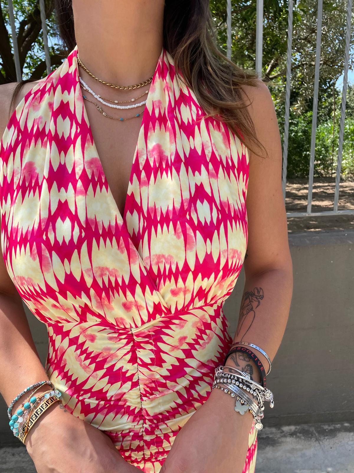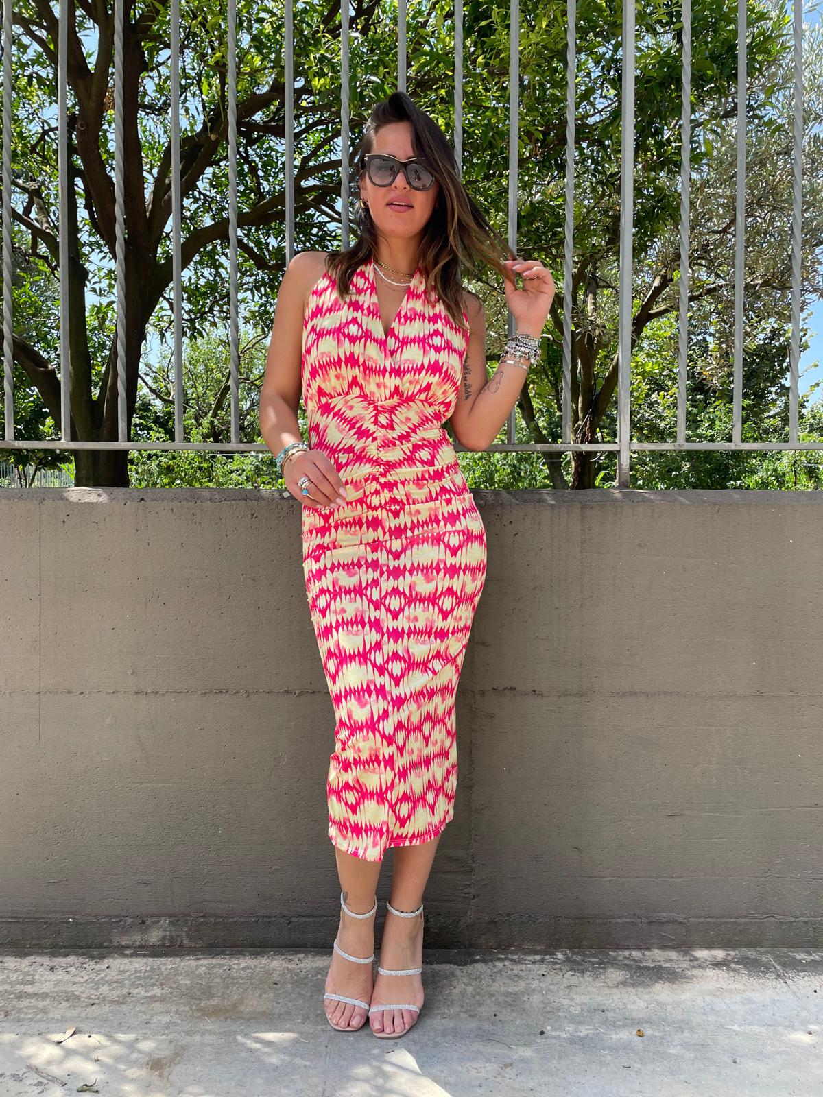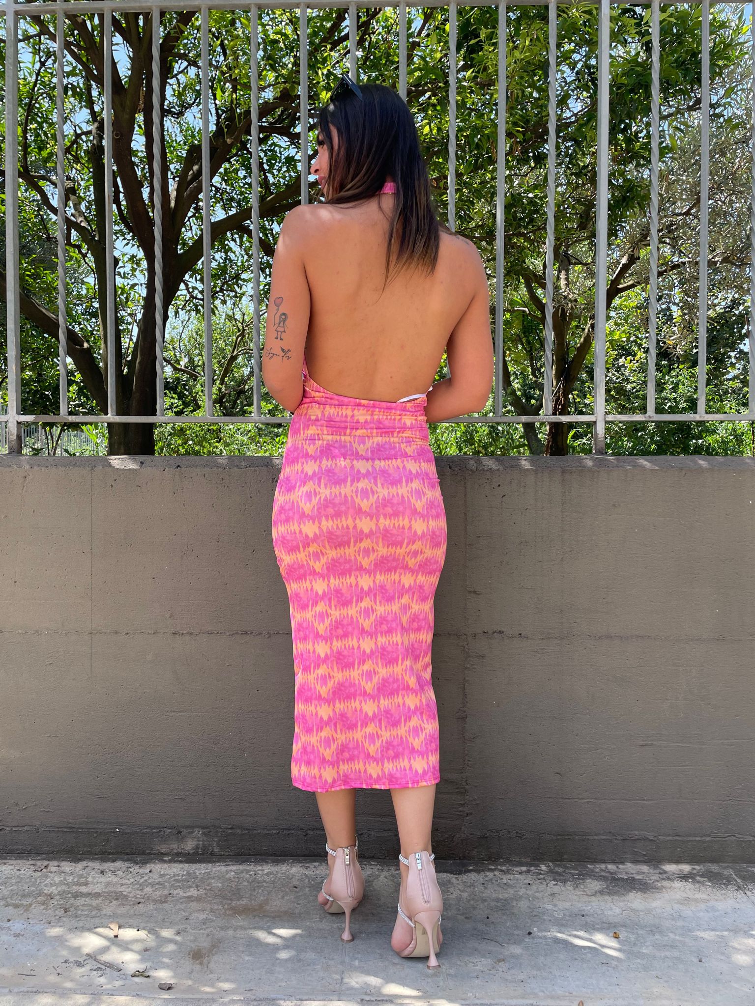 Vestito fantasia astratta con drappeggio e schiena scoperta