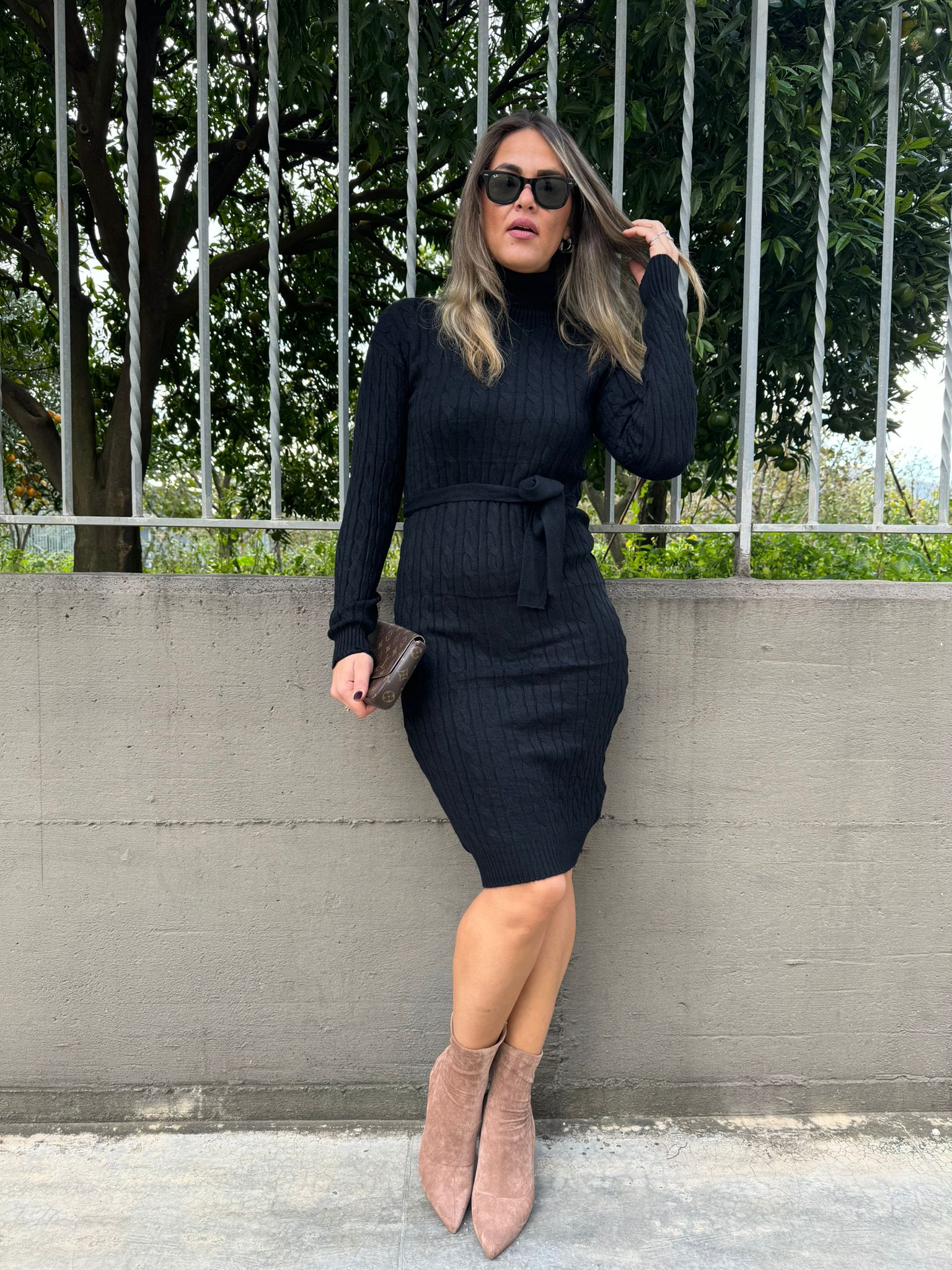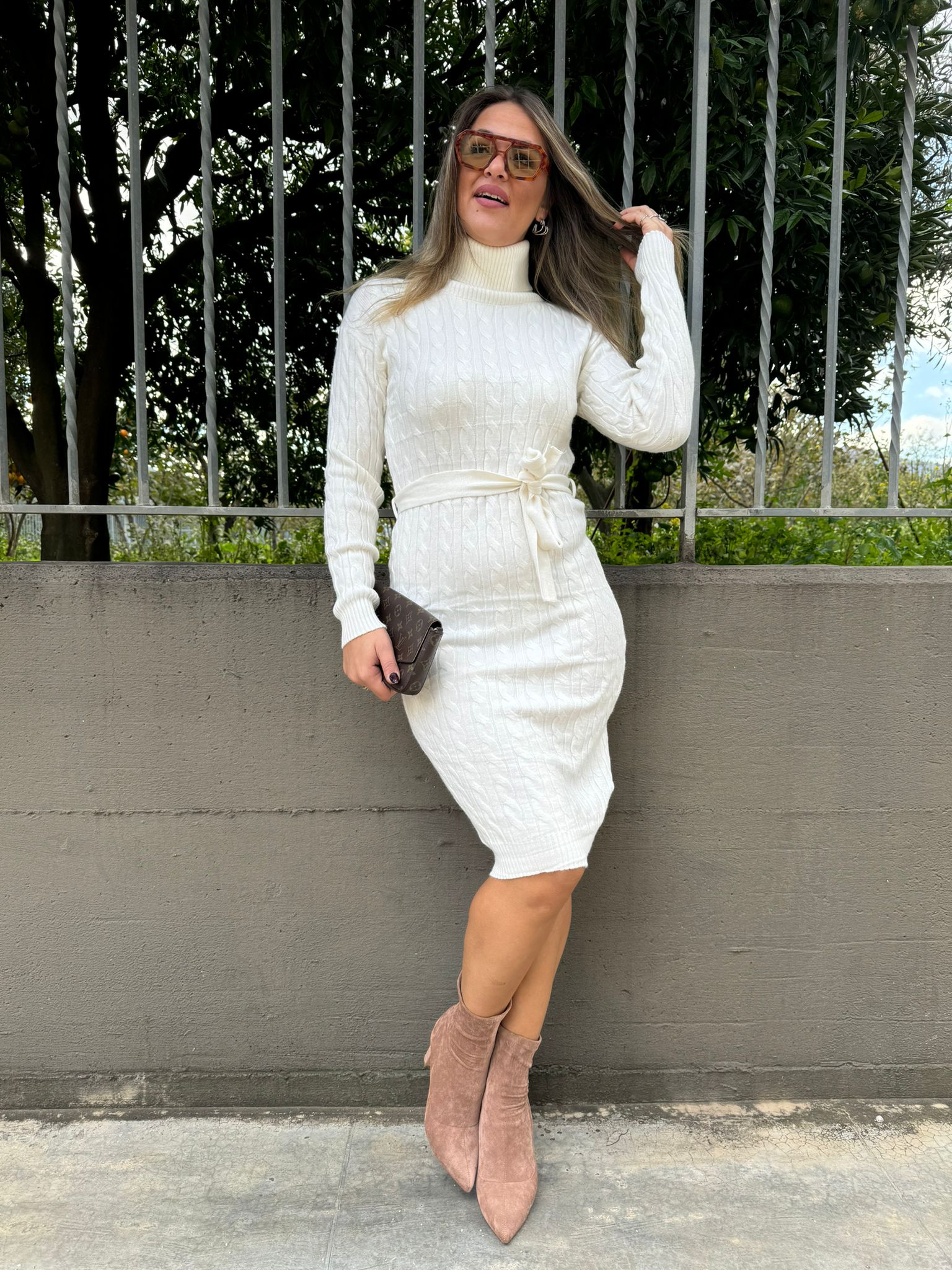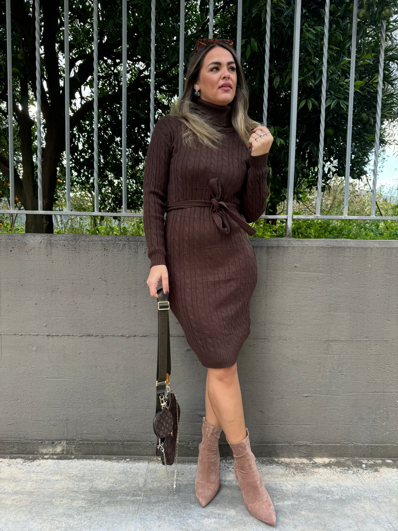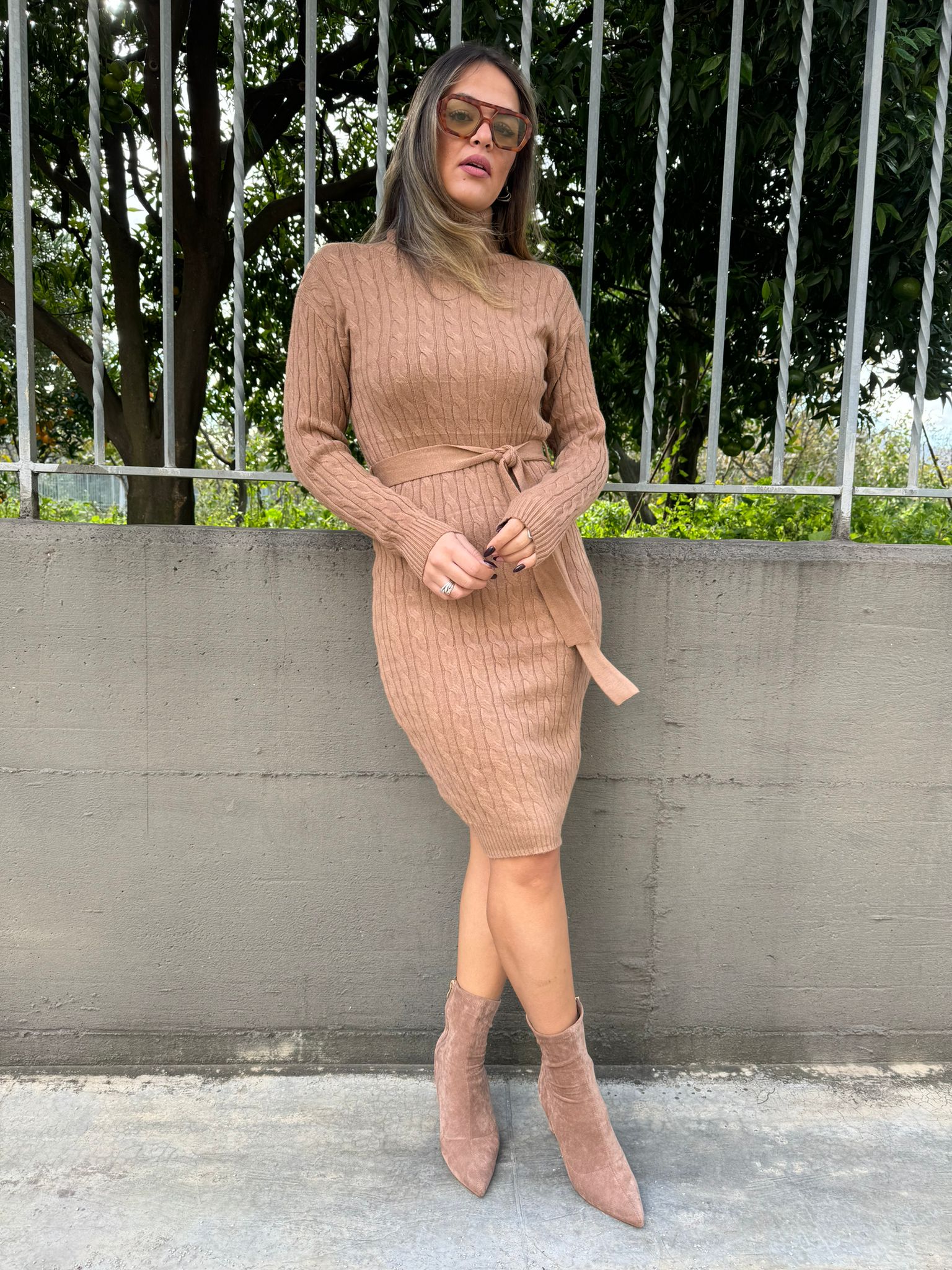 Vestito in simil lana trama treccia con cintura