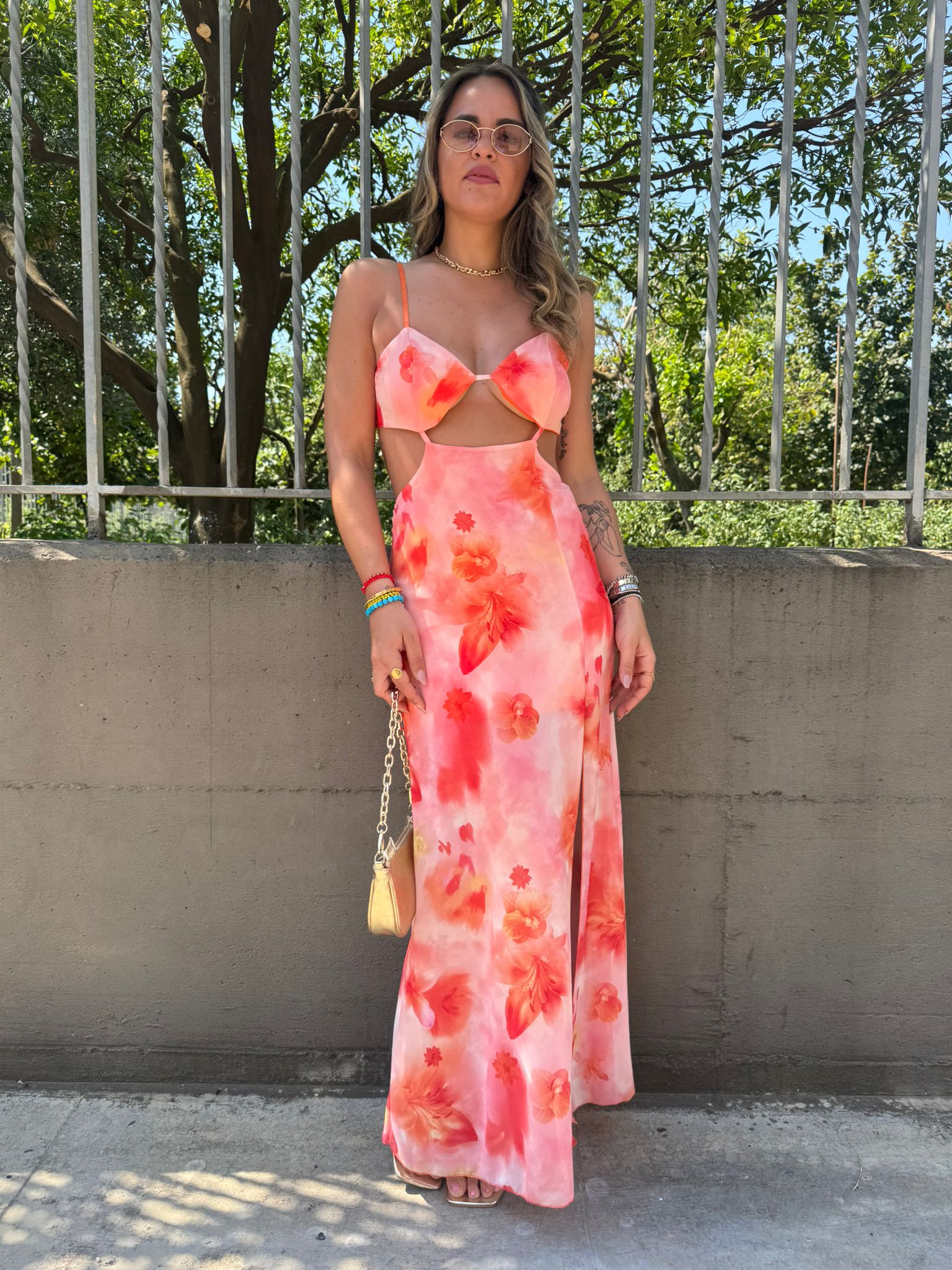 Vestito lungo a fantasia con aperture laterali e nodo dietro