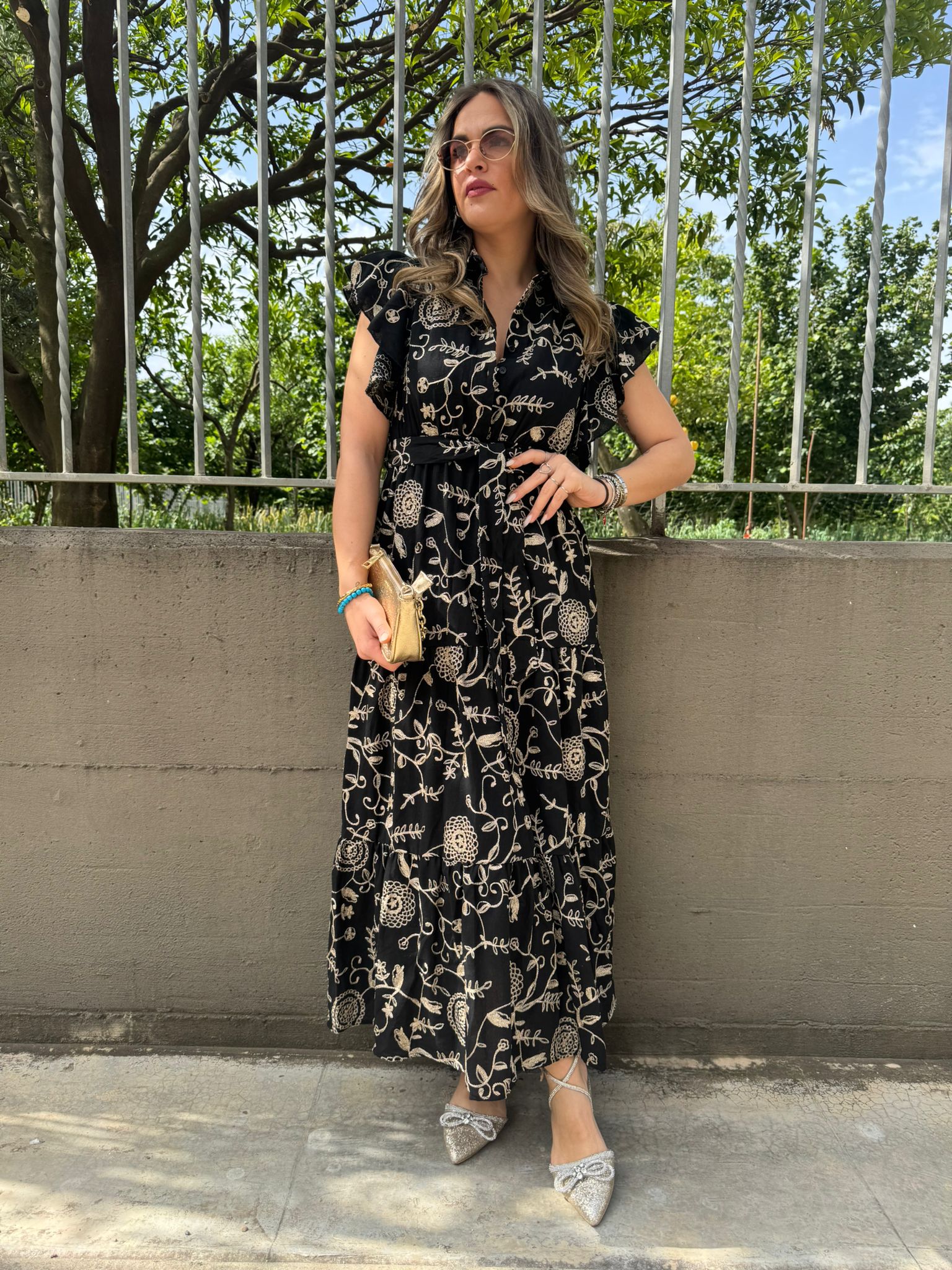 Vestito lungo con ricami dorati
