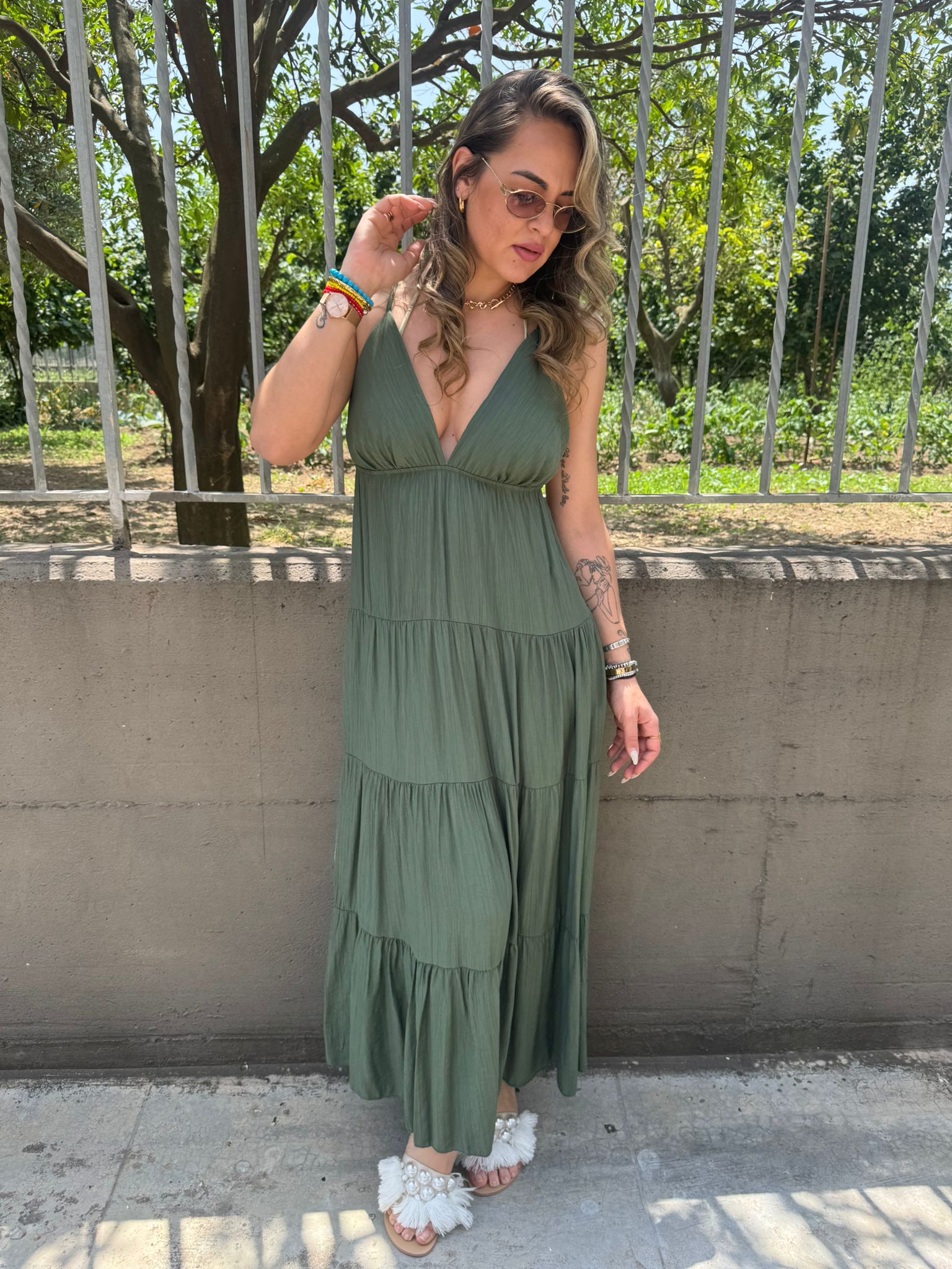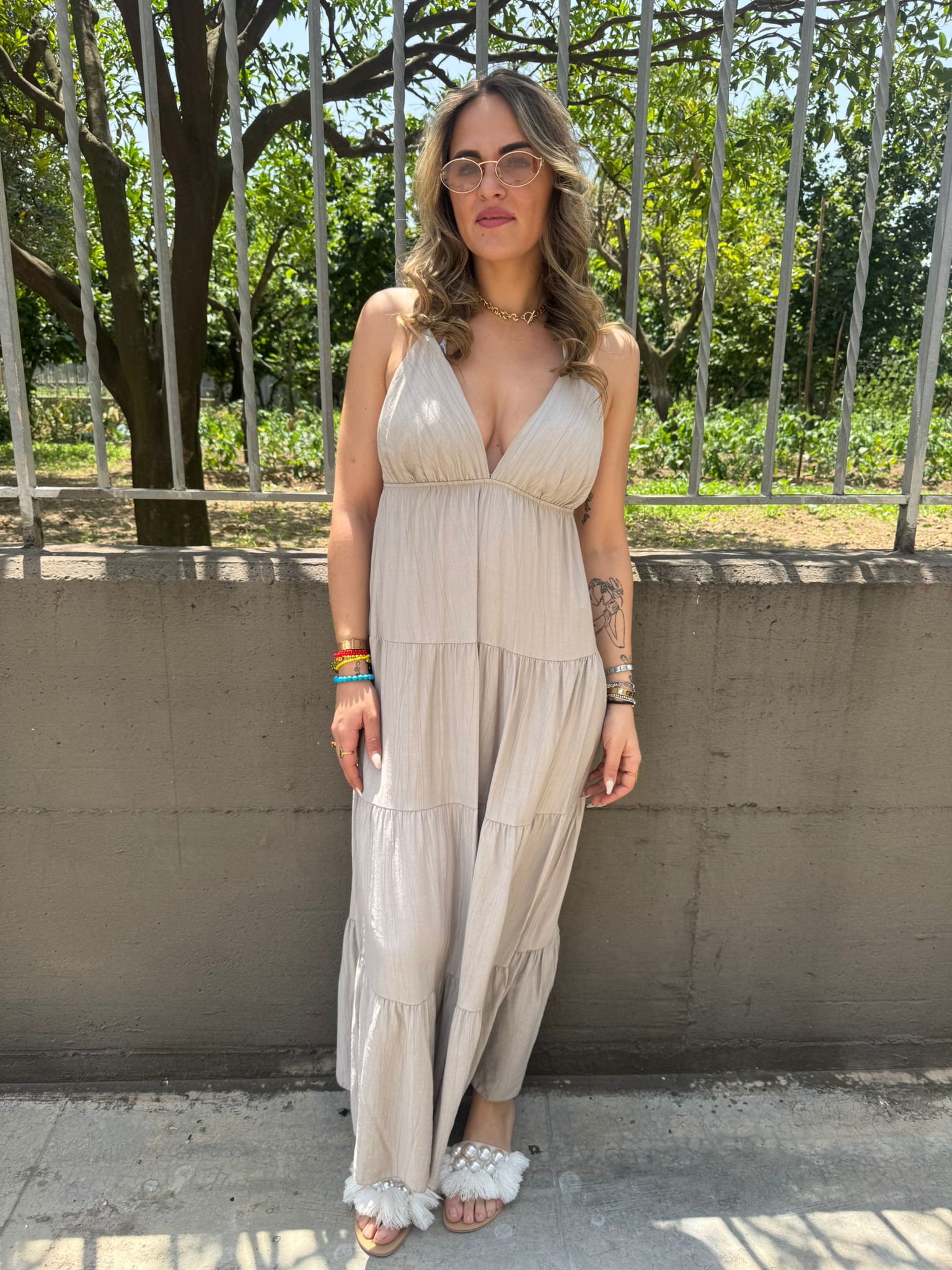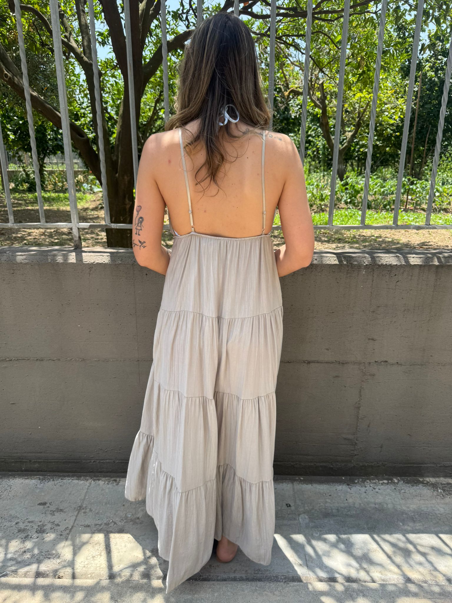 Vestito lungo effetto lino con balze