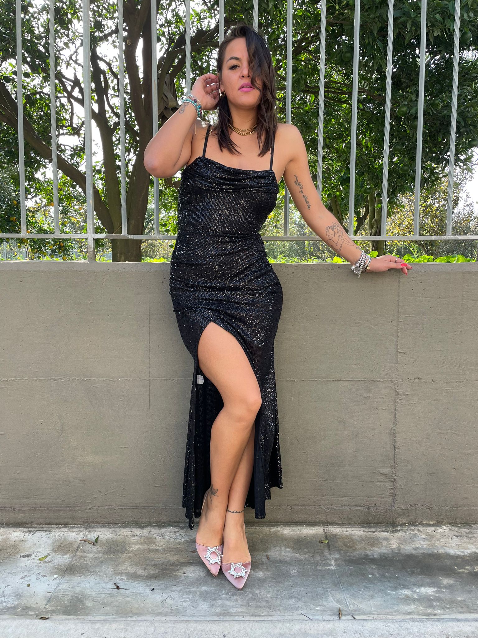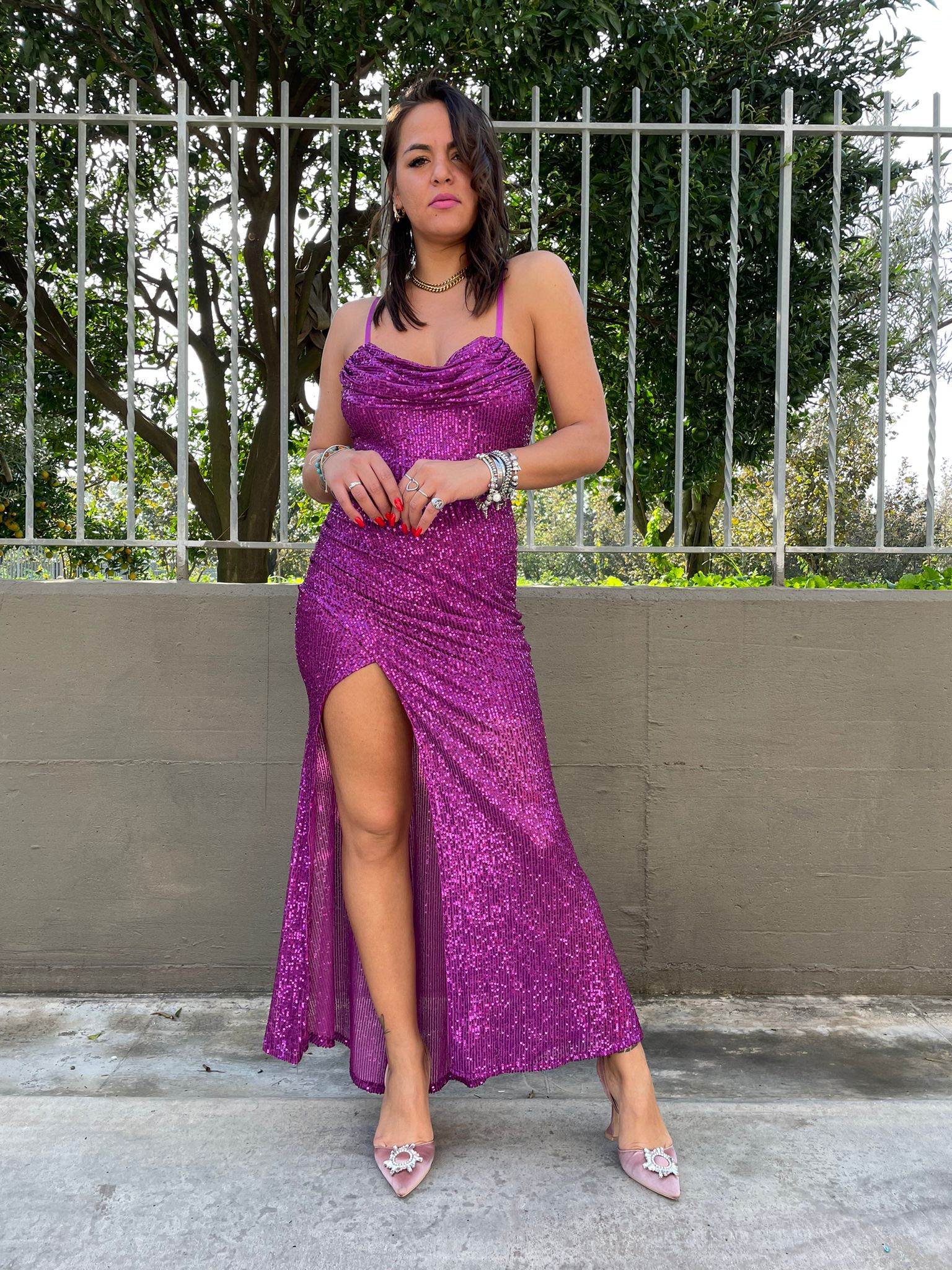Vestito lungo in paillettes con spacco
