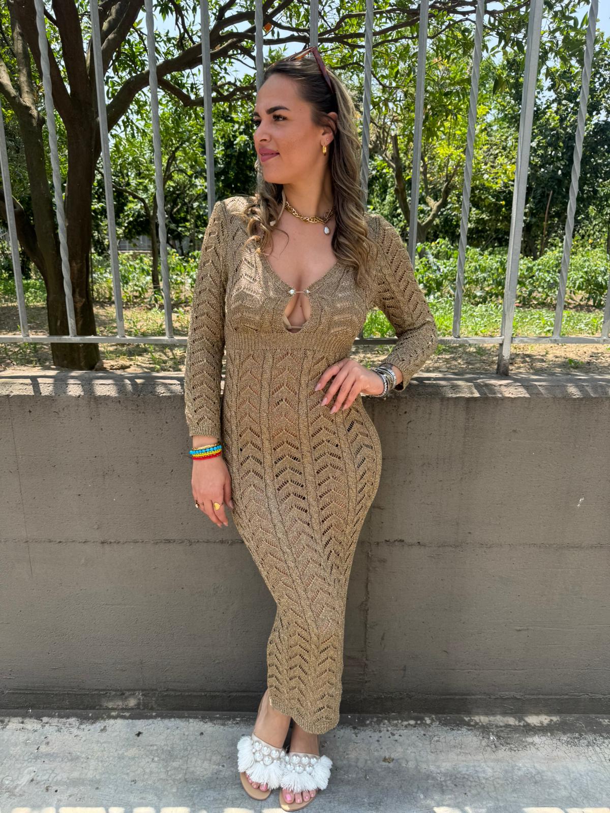 Vestito lungo traforato con schiena scoperta e perla centrale