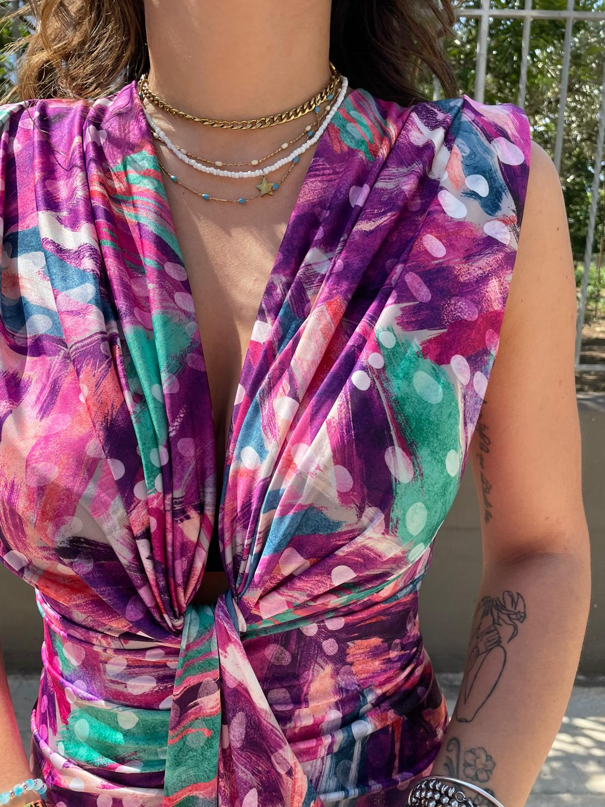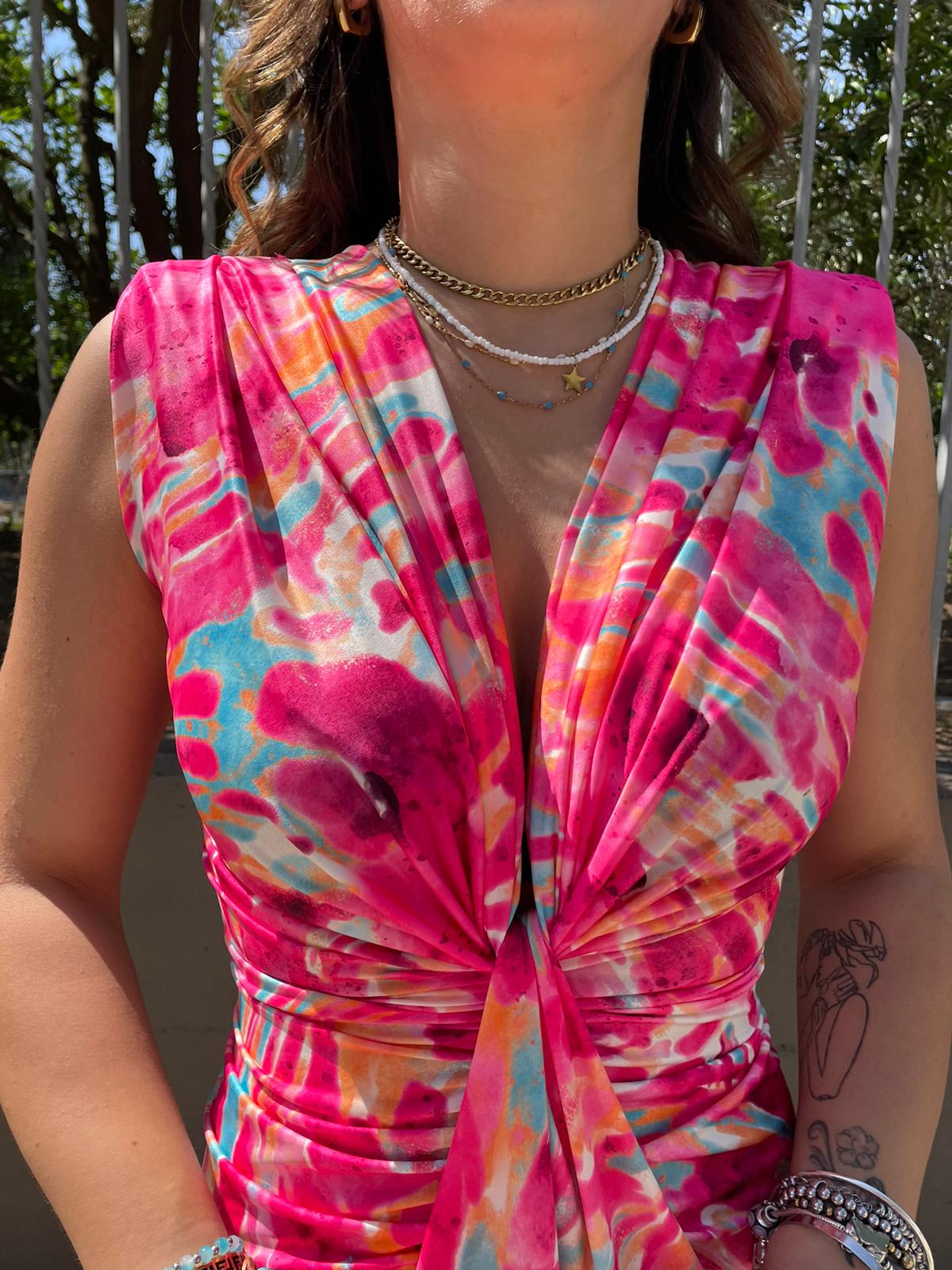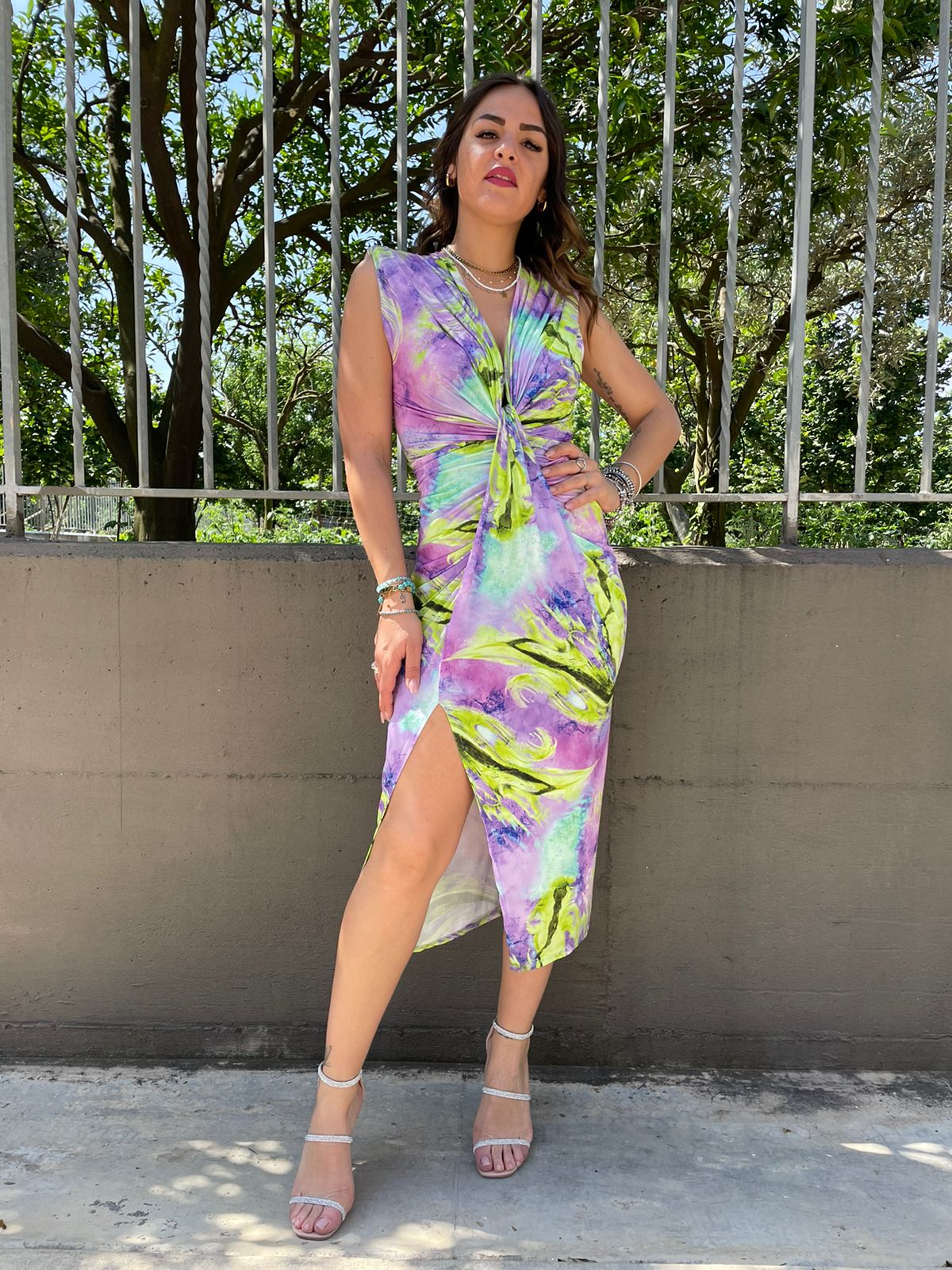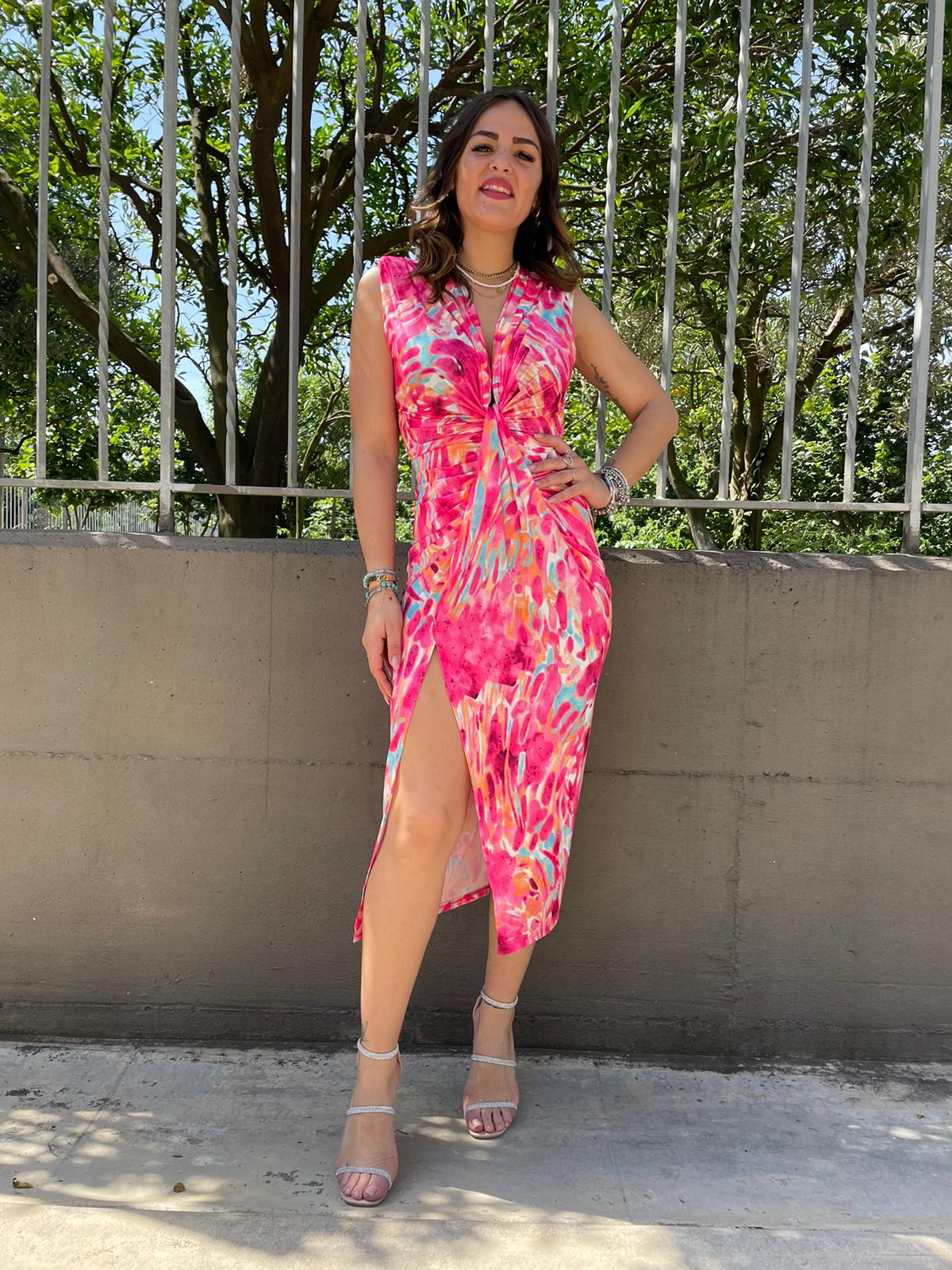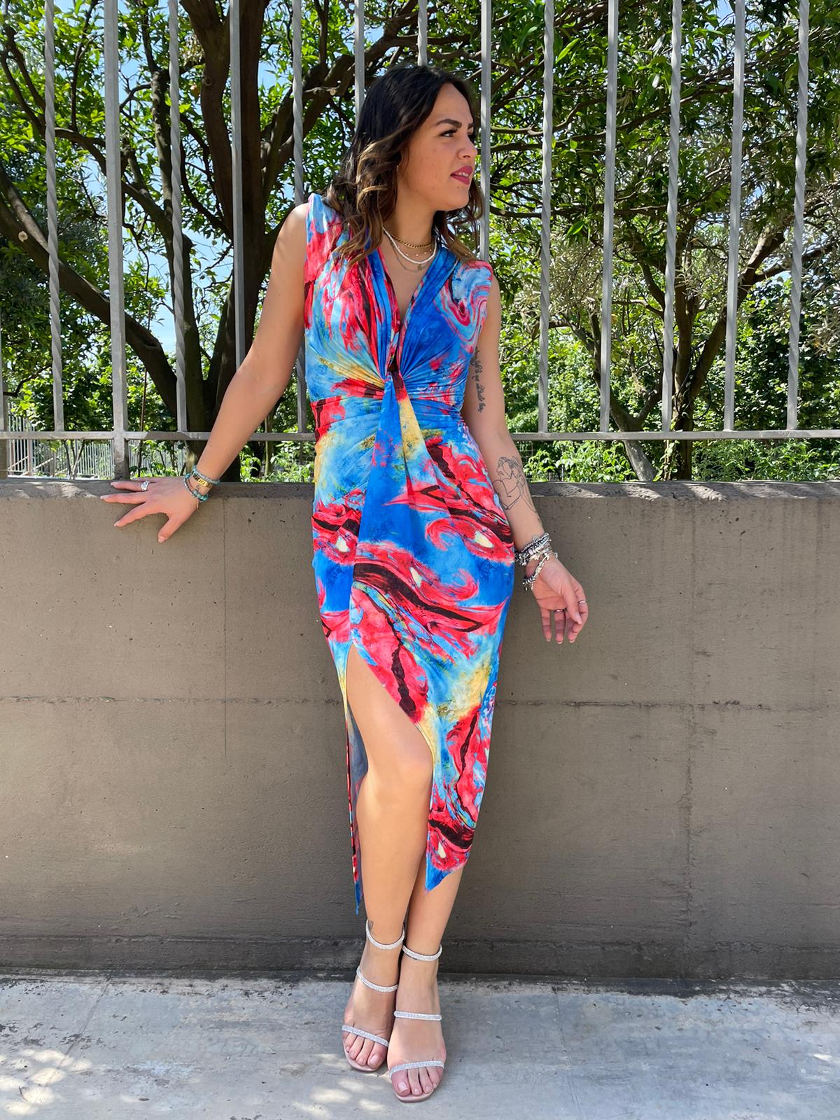 Vestito midi fantasia sfumata con nodo avanti