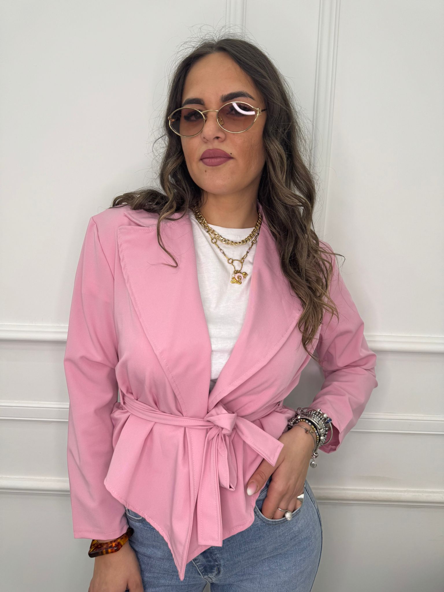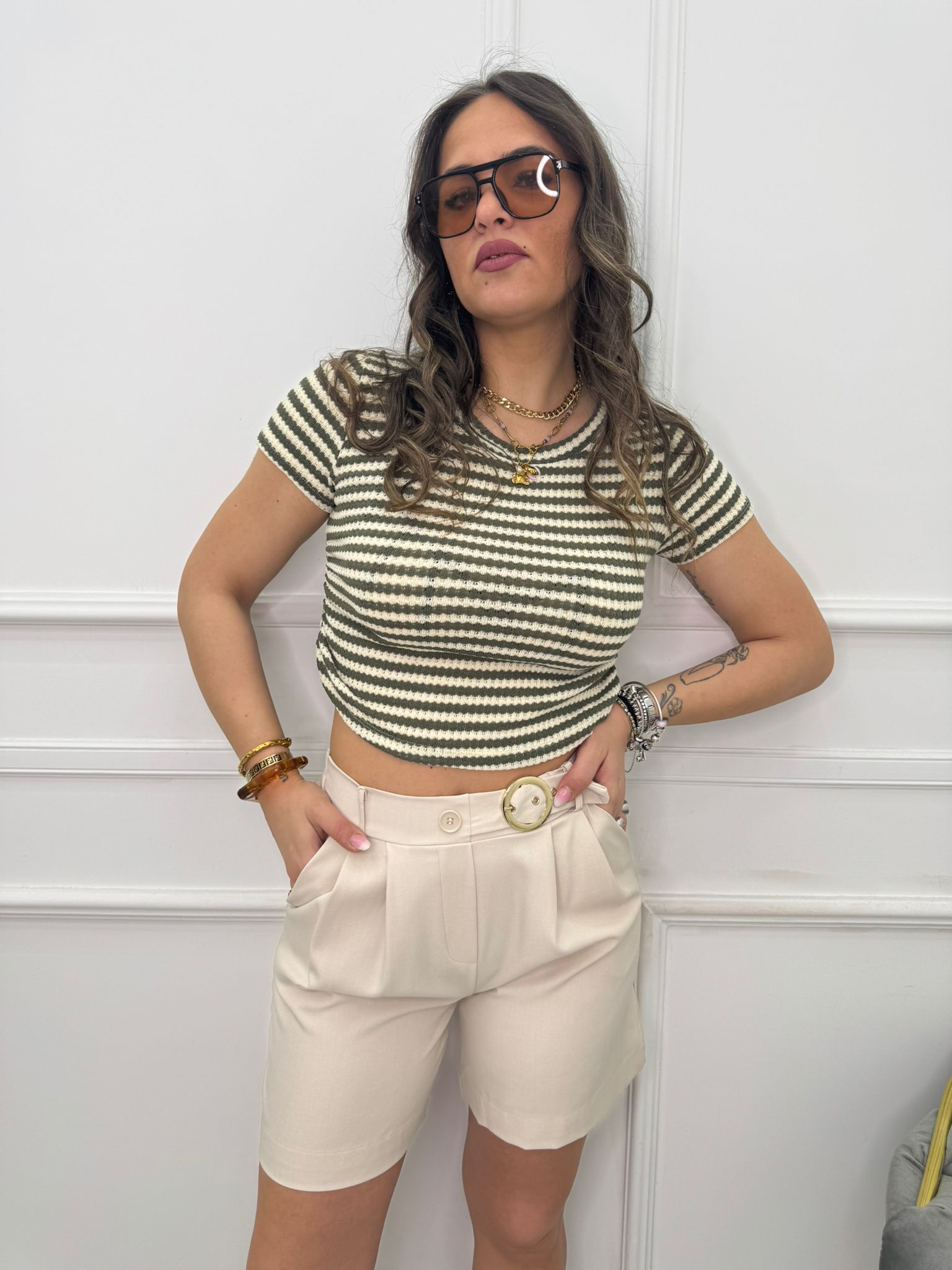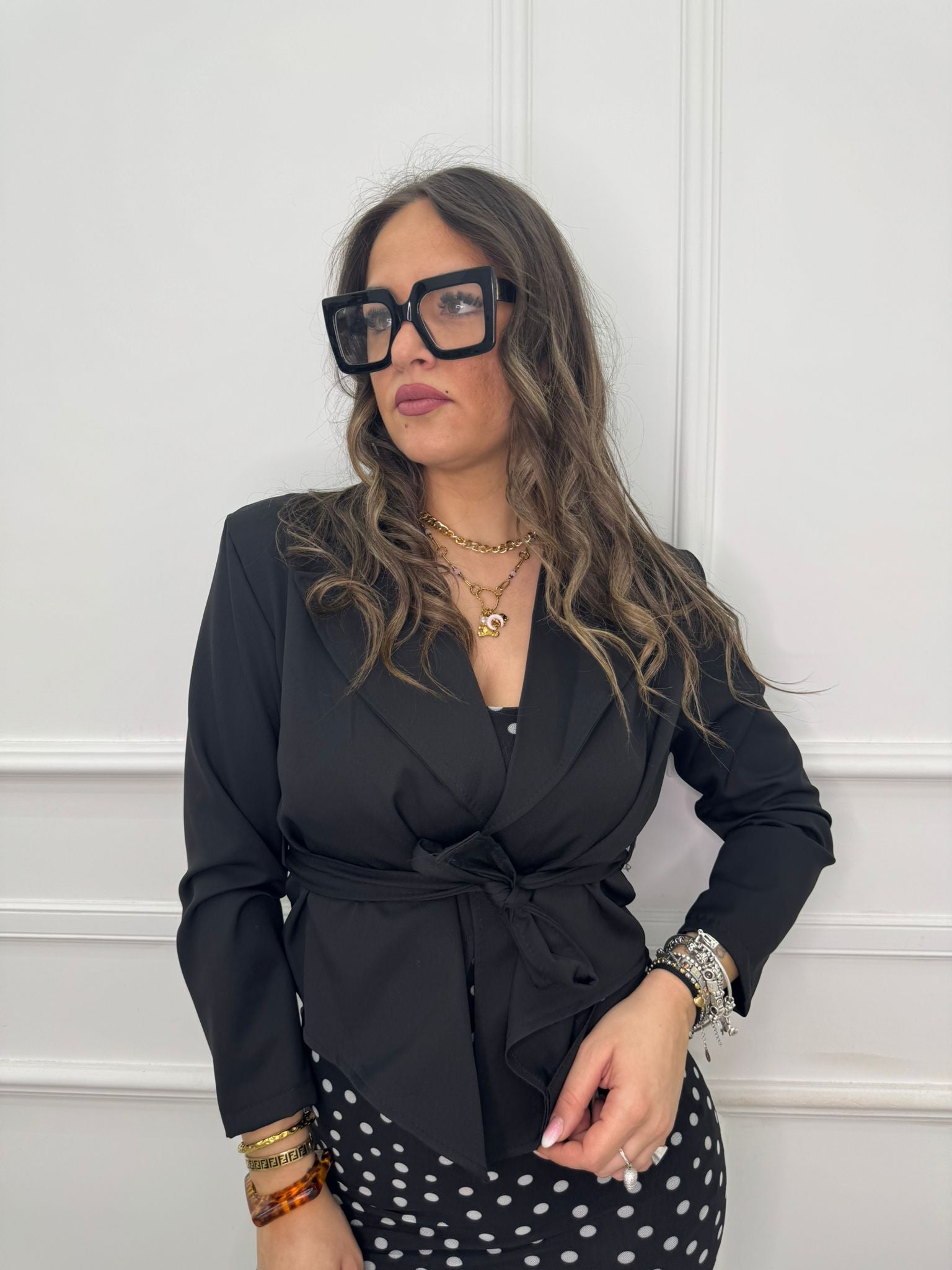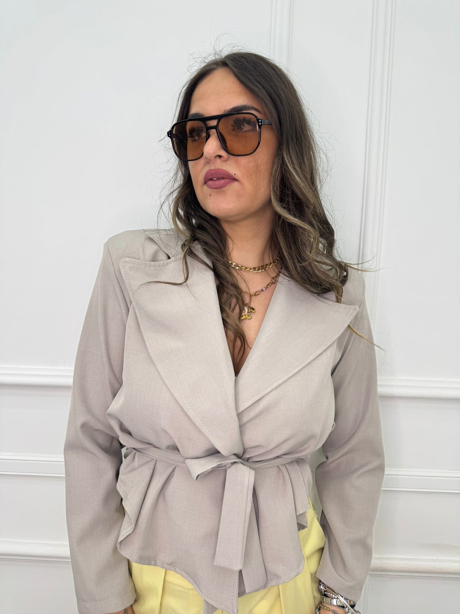 - La modella è una taglia 44, alta 1,79m e indossa la taglia "M/L"
