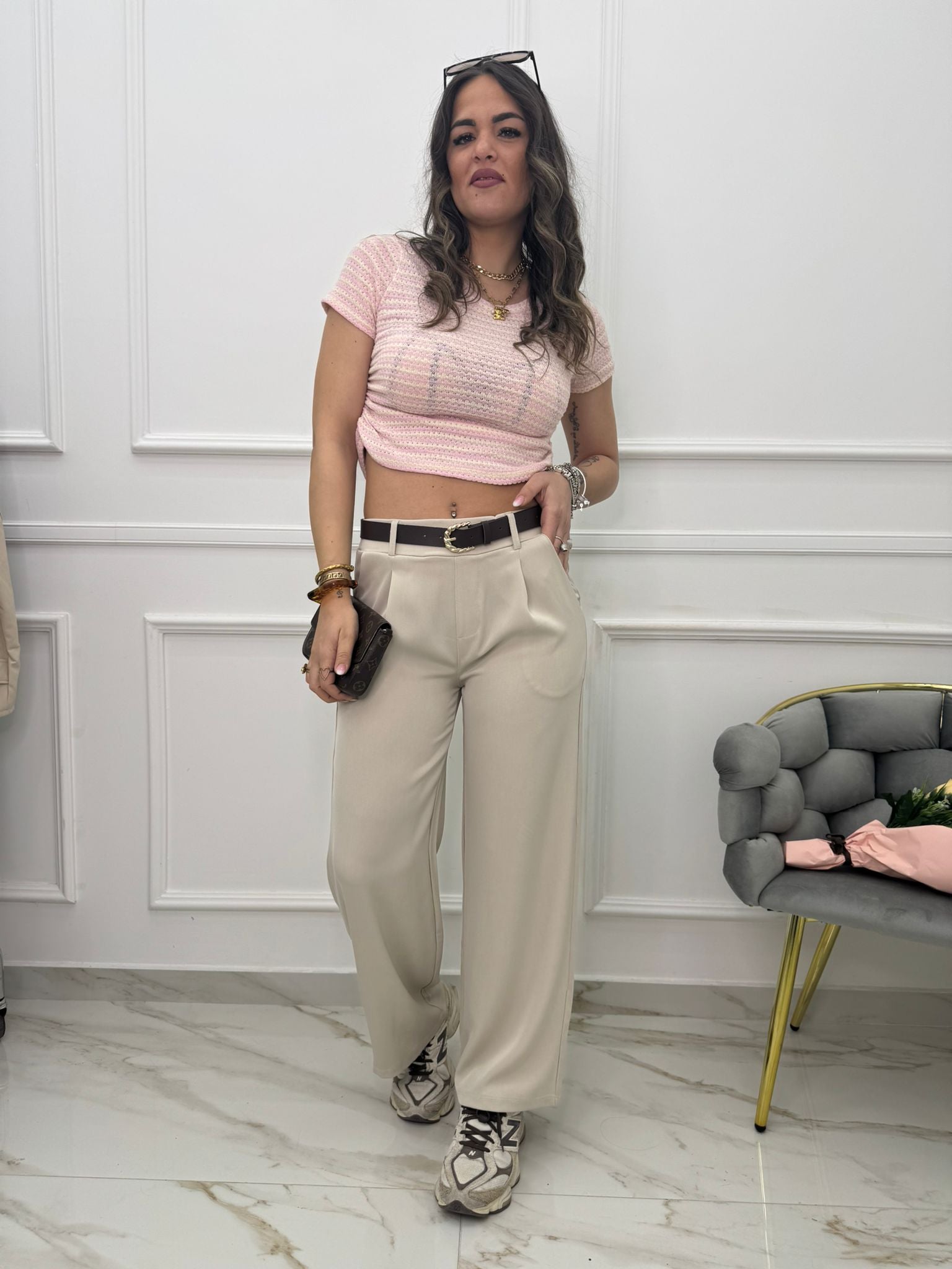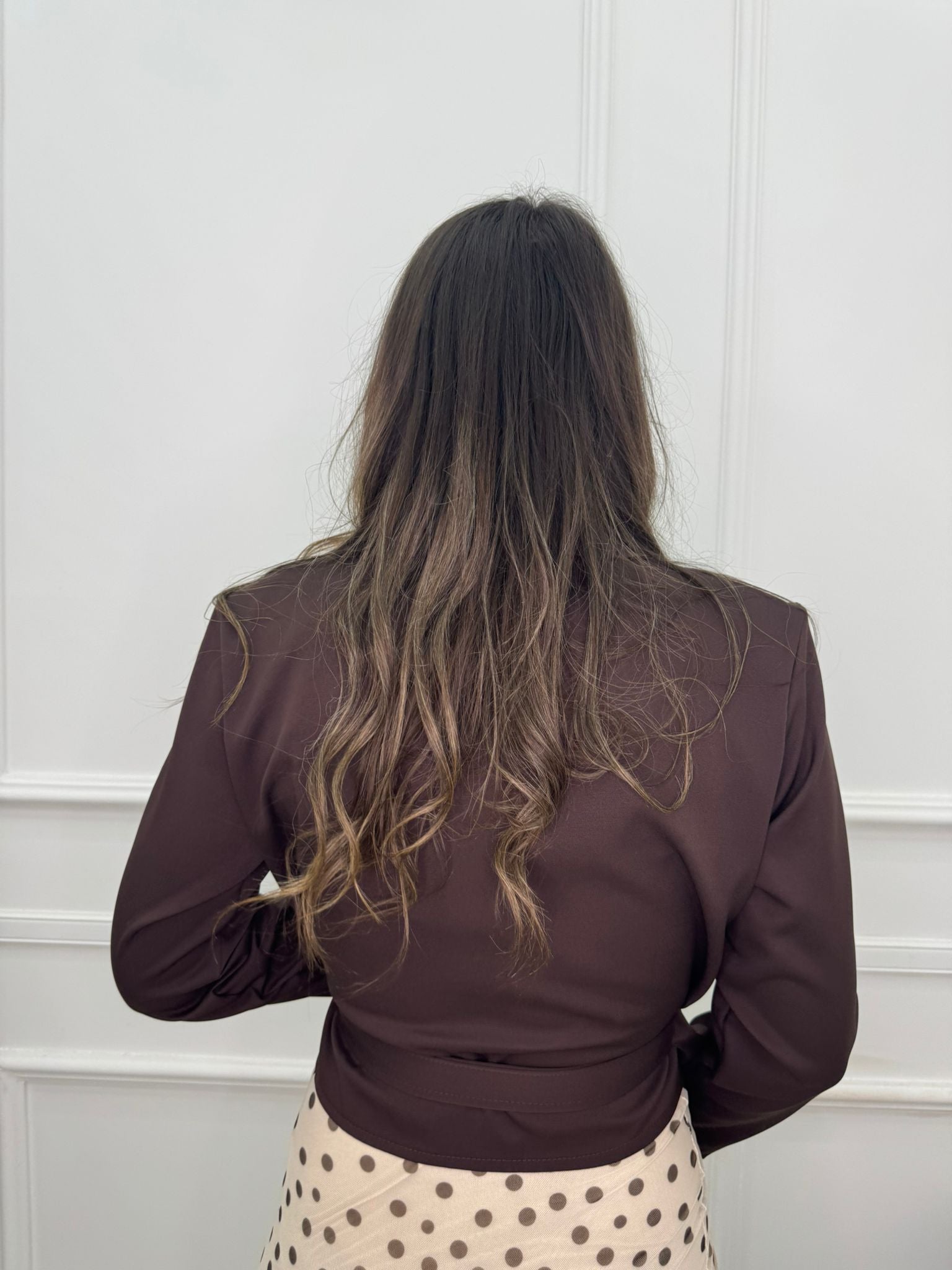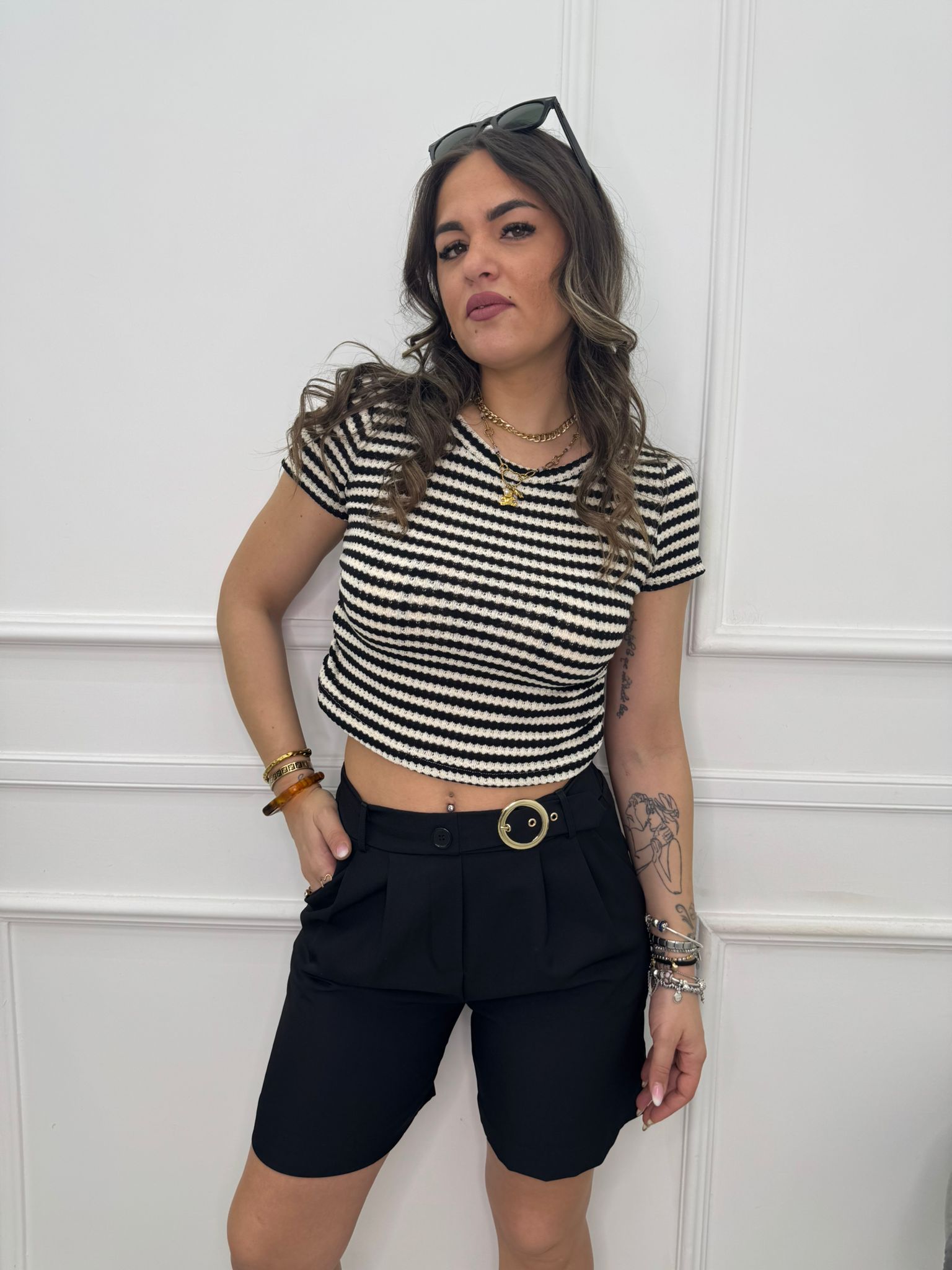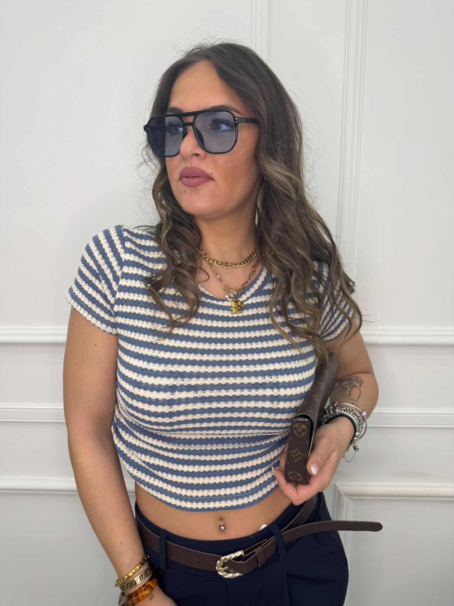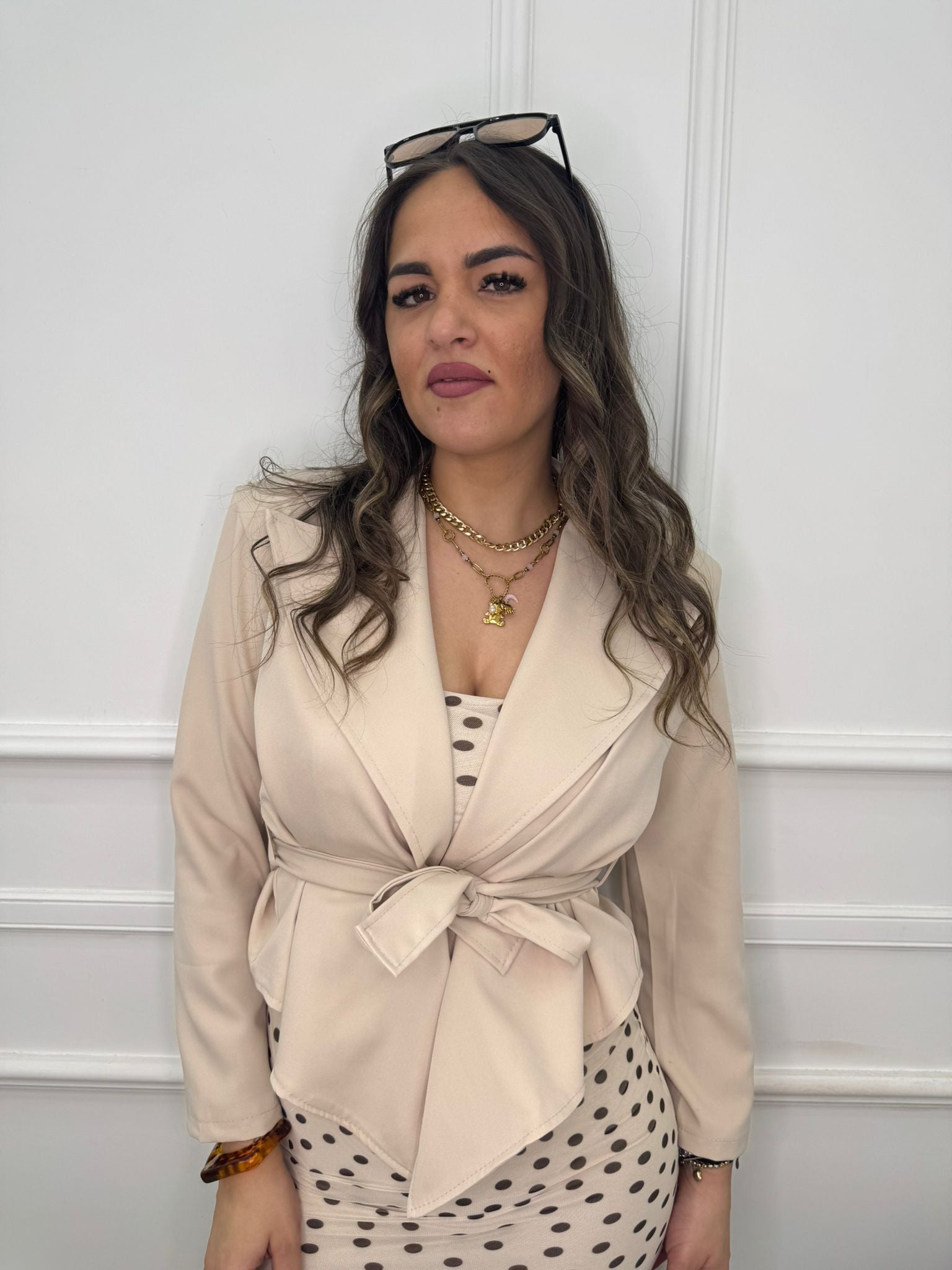 - La modella è una taglia 44, alta 1,79m e indossa la taglia "M/L"