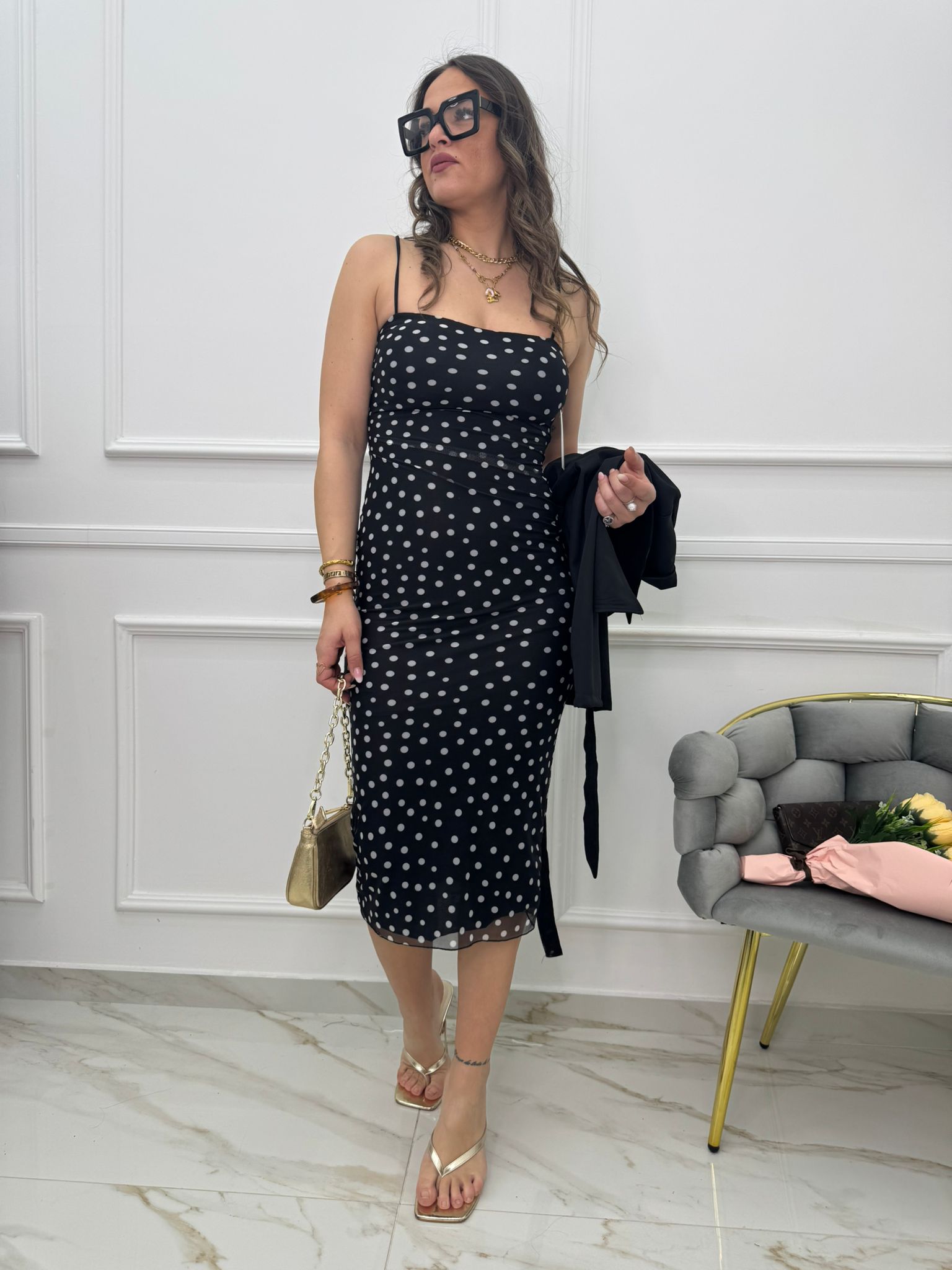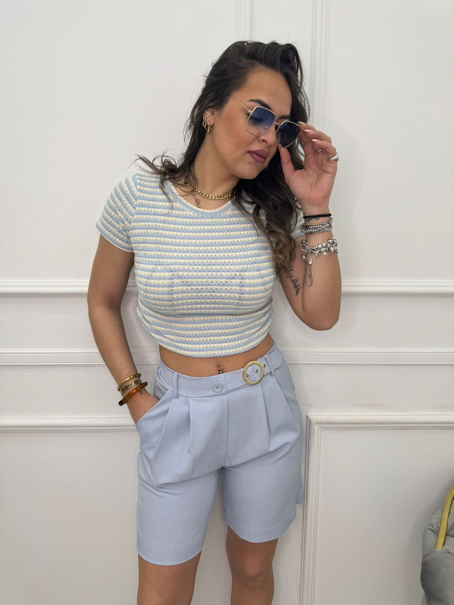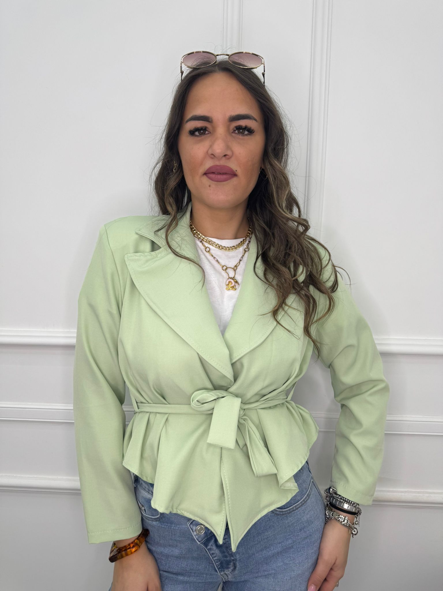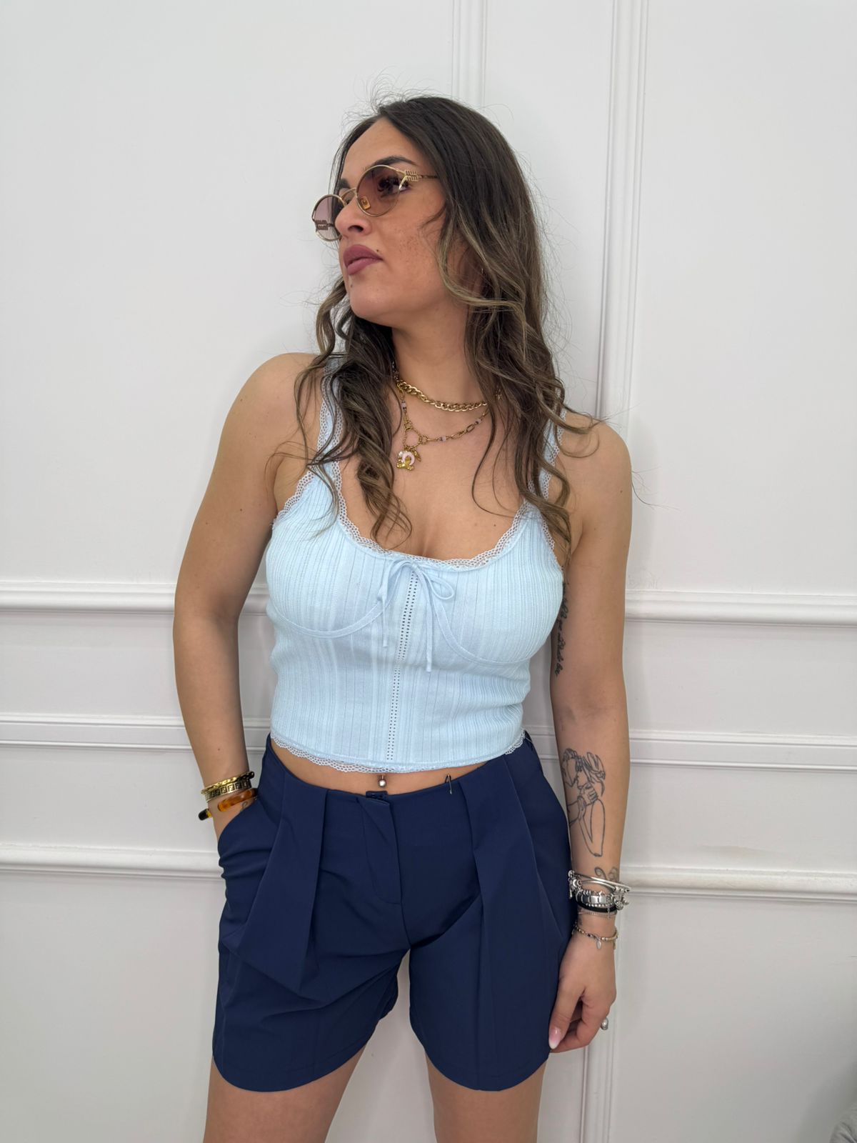 - La modella è una taglia 44, alta 1,79m e indossa la taglia "M/L"