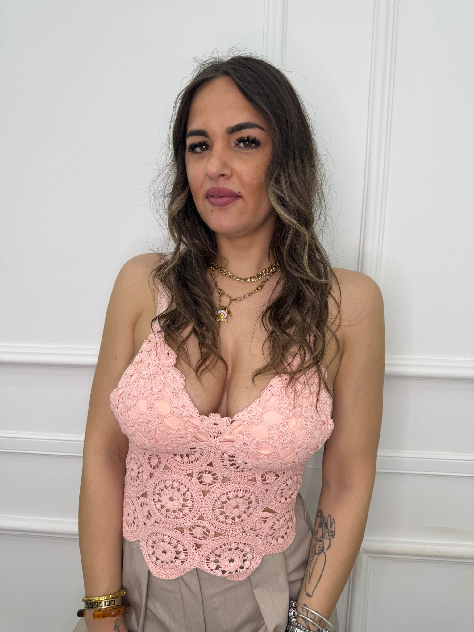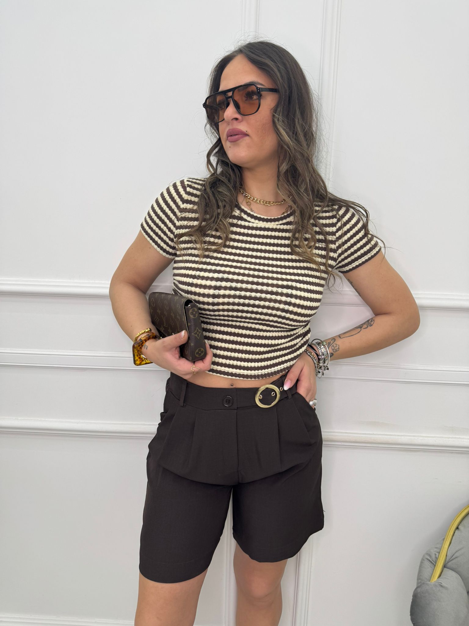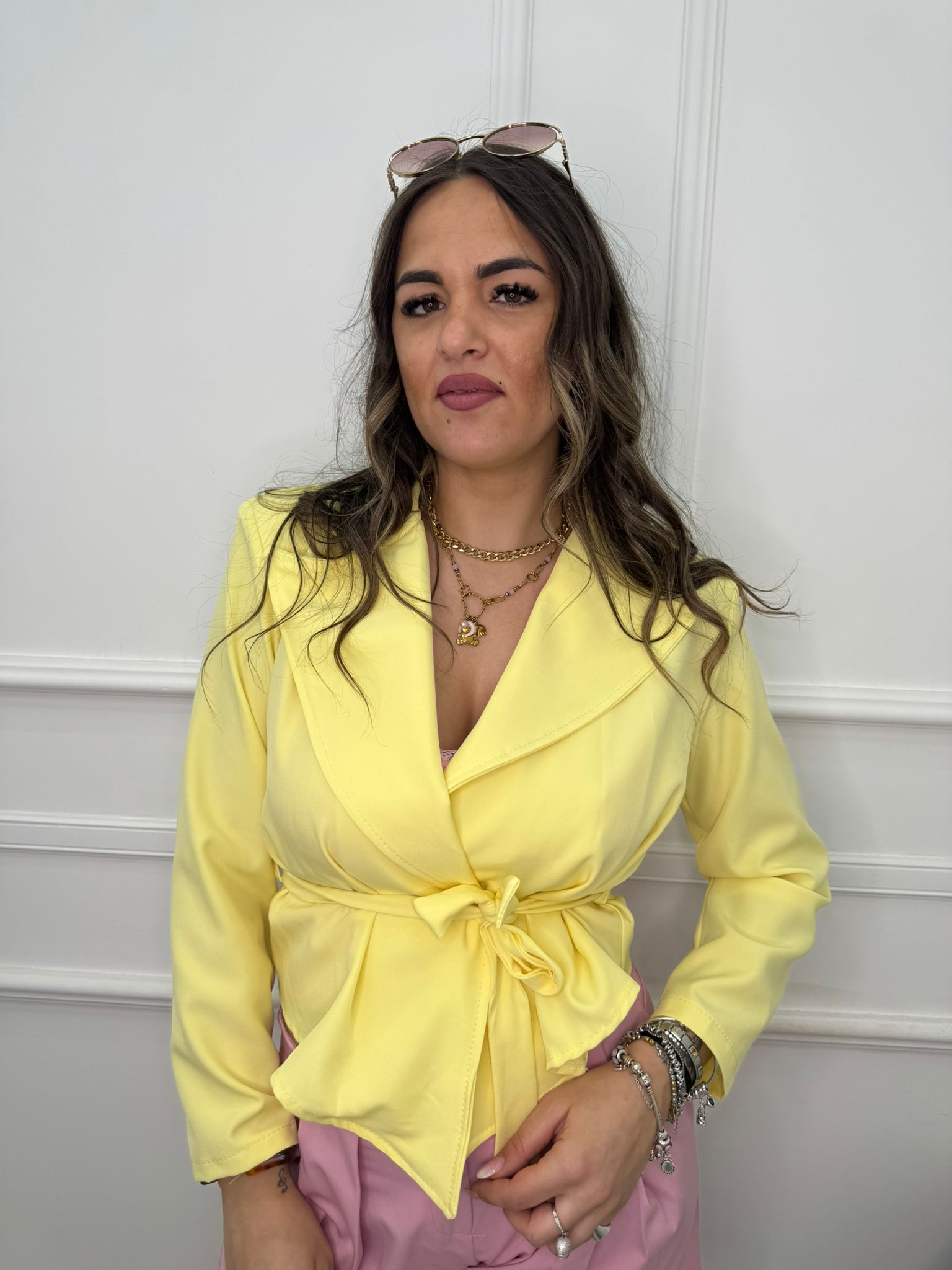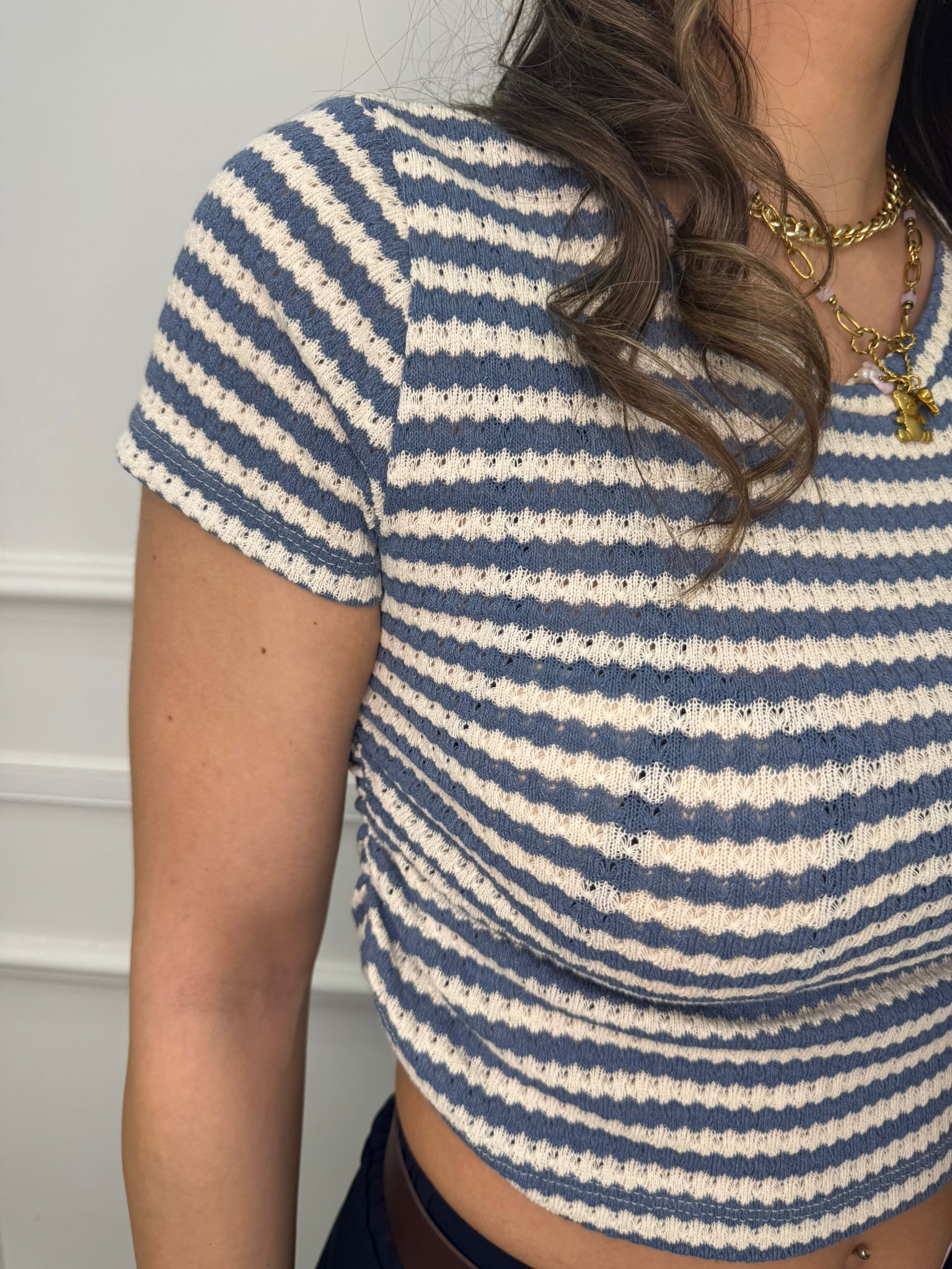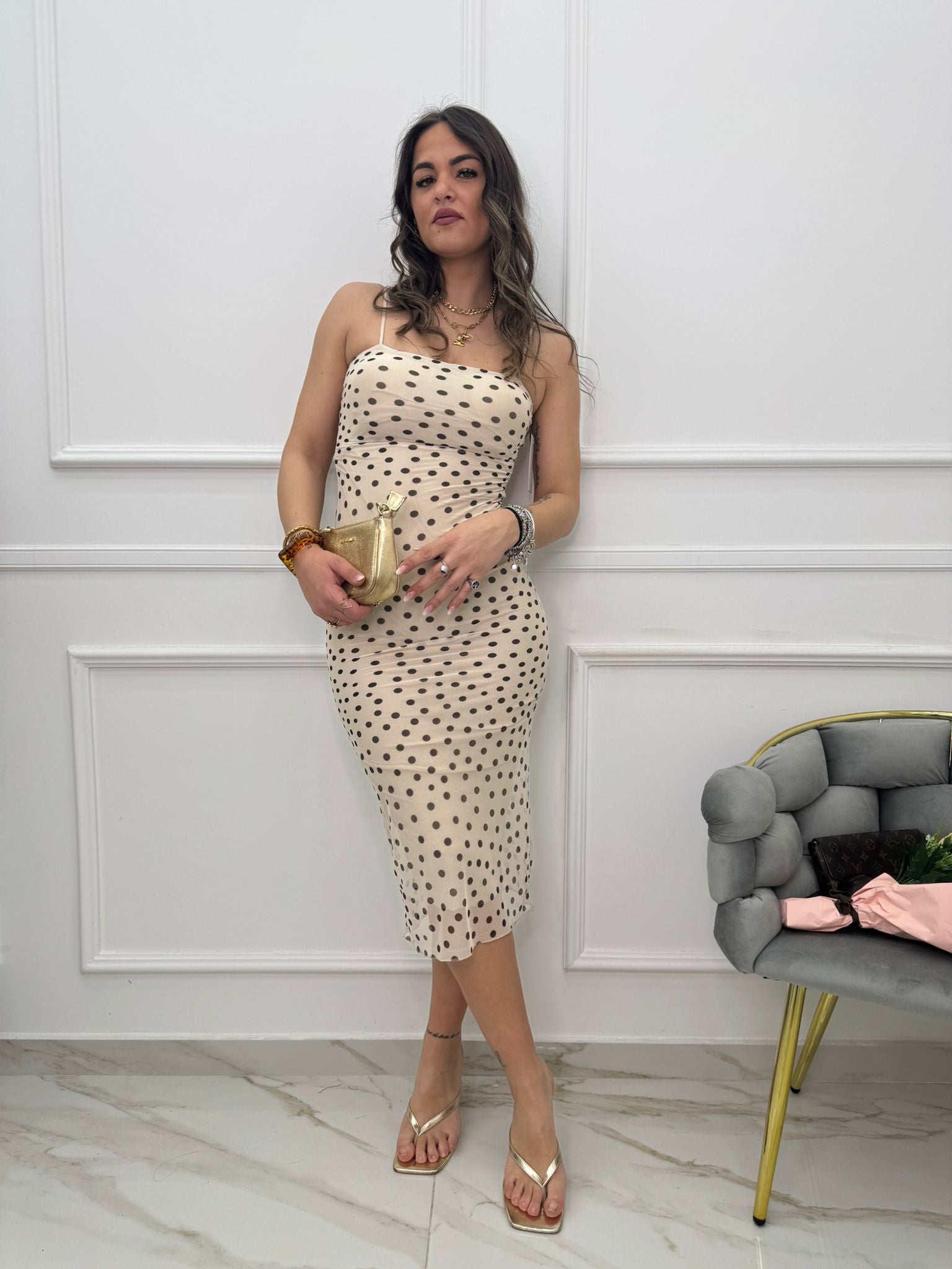 - La modella è una taglia 44, alta 1,79m e indossa la taglia "M/L"