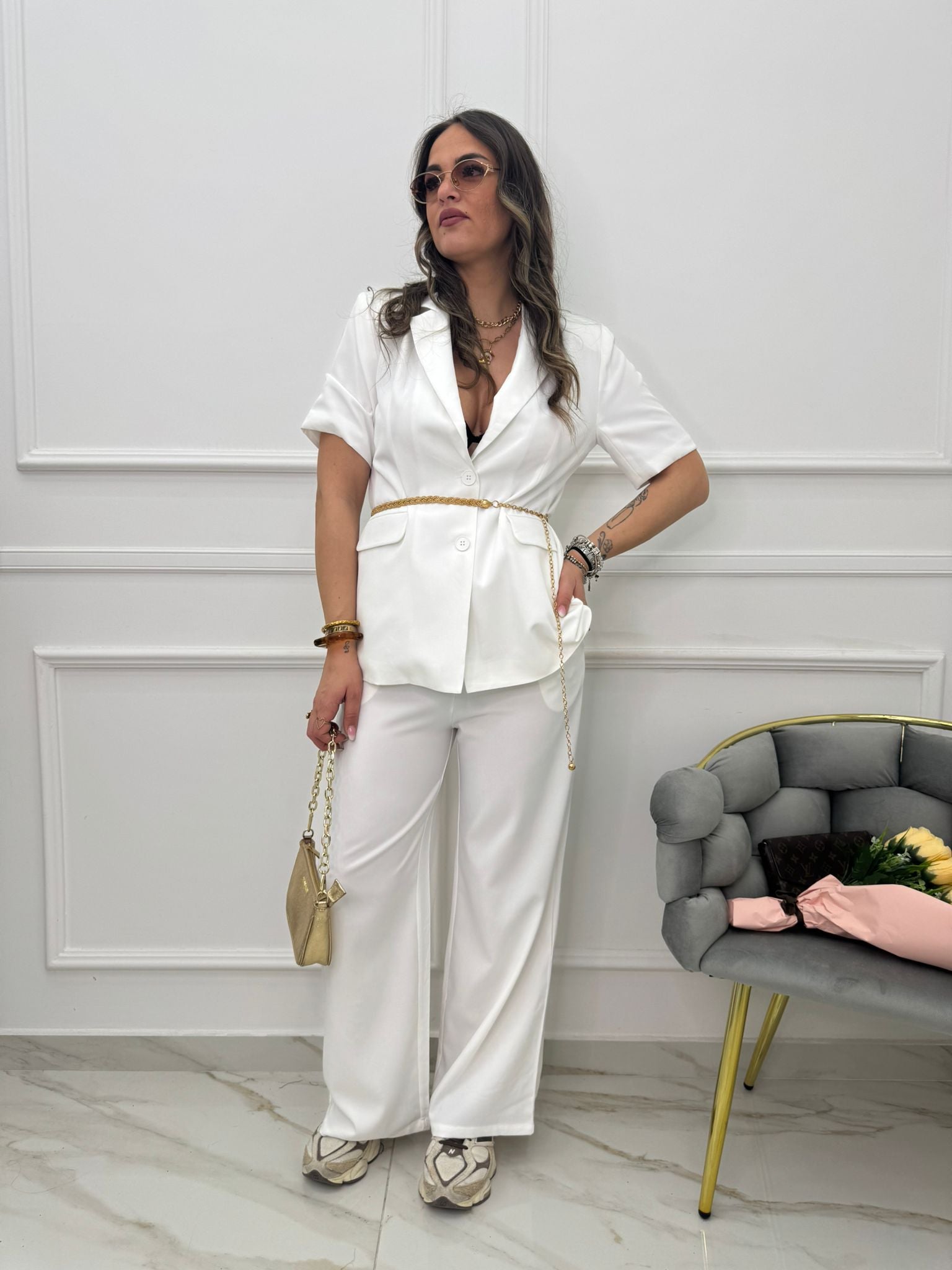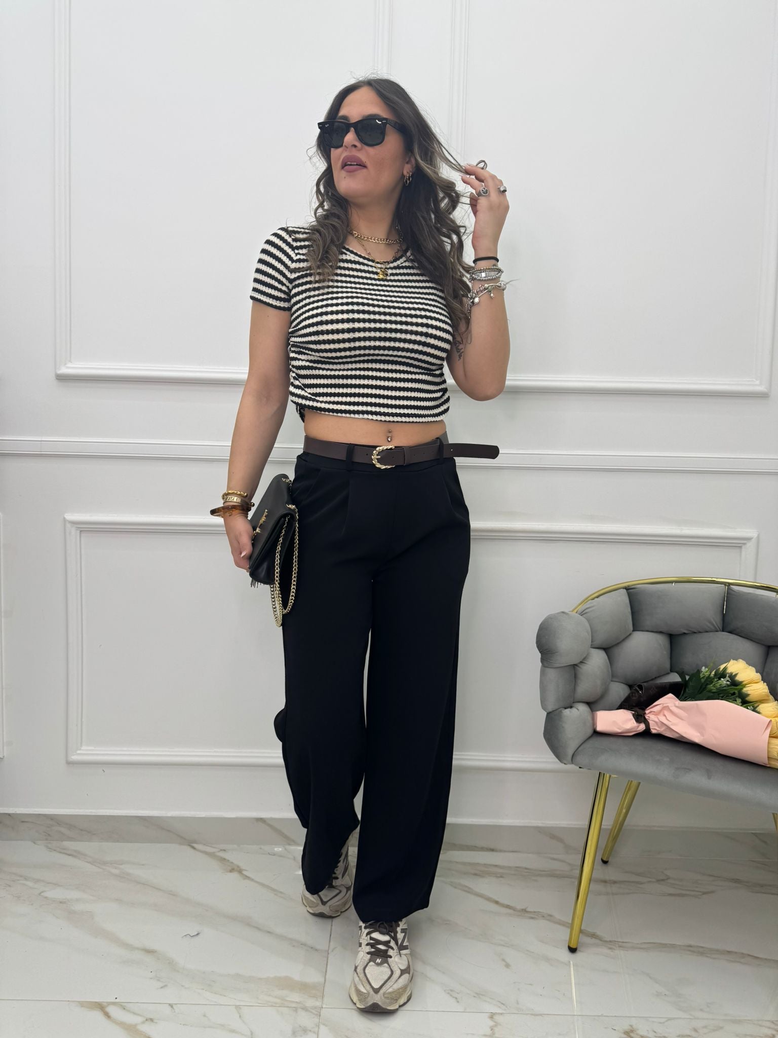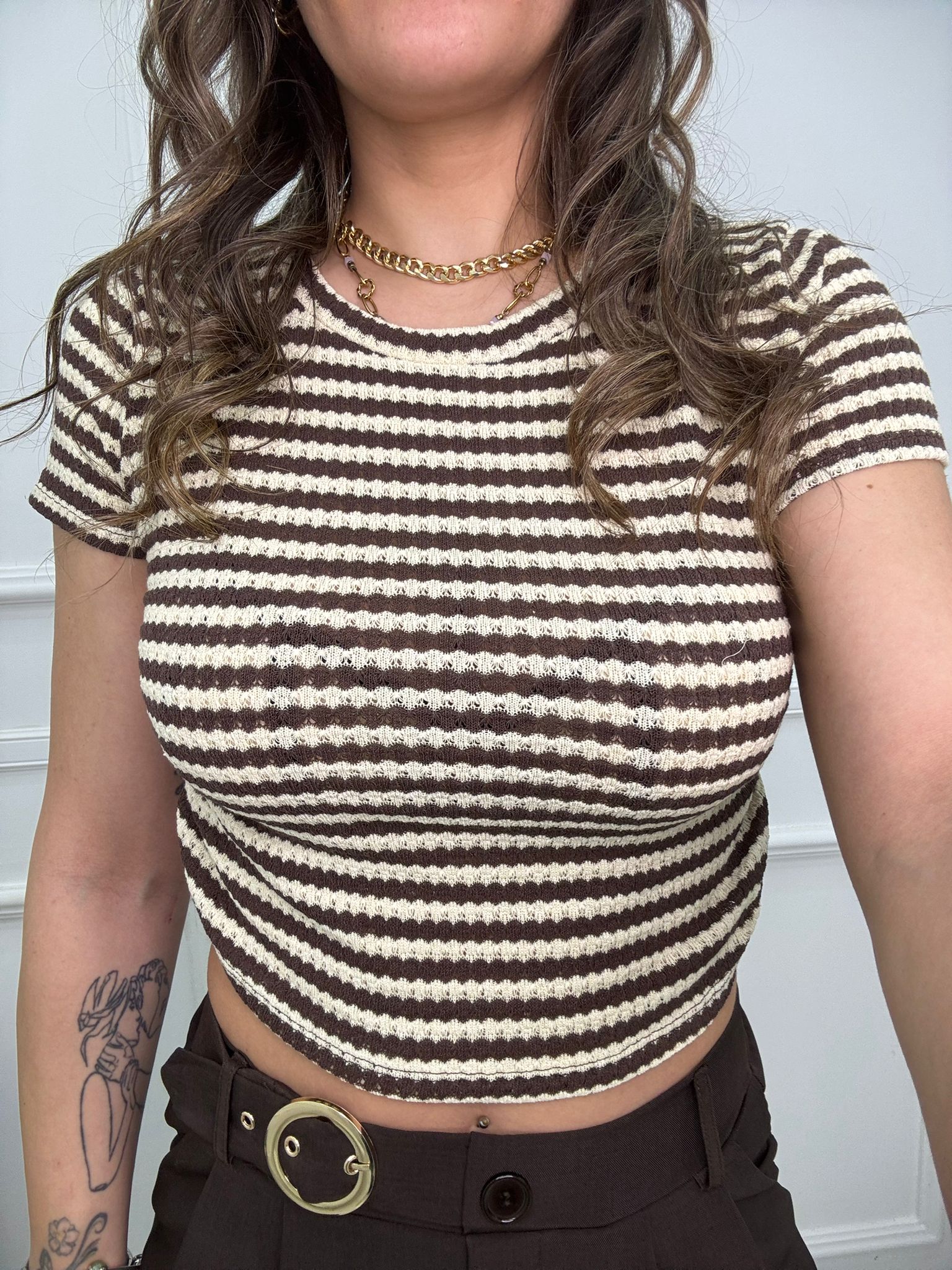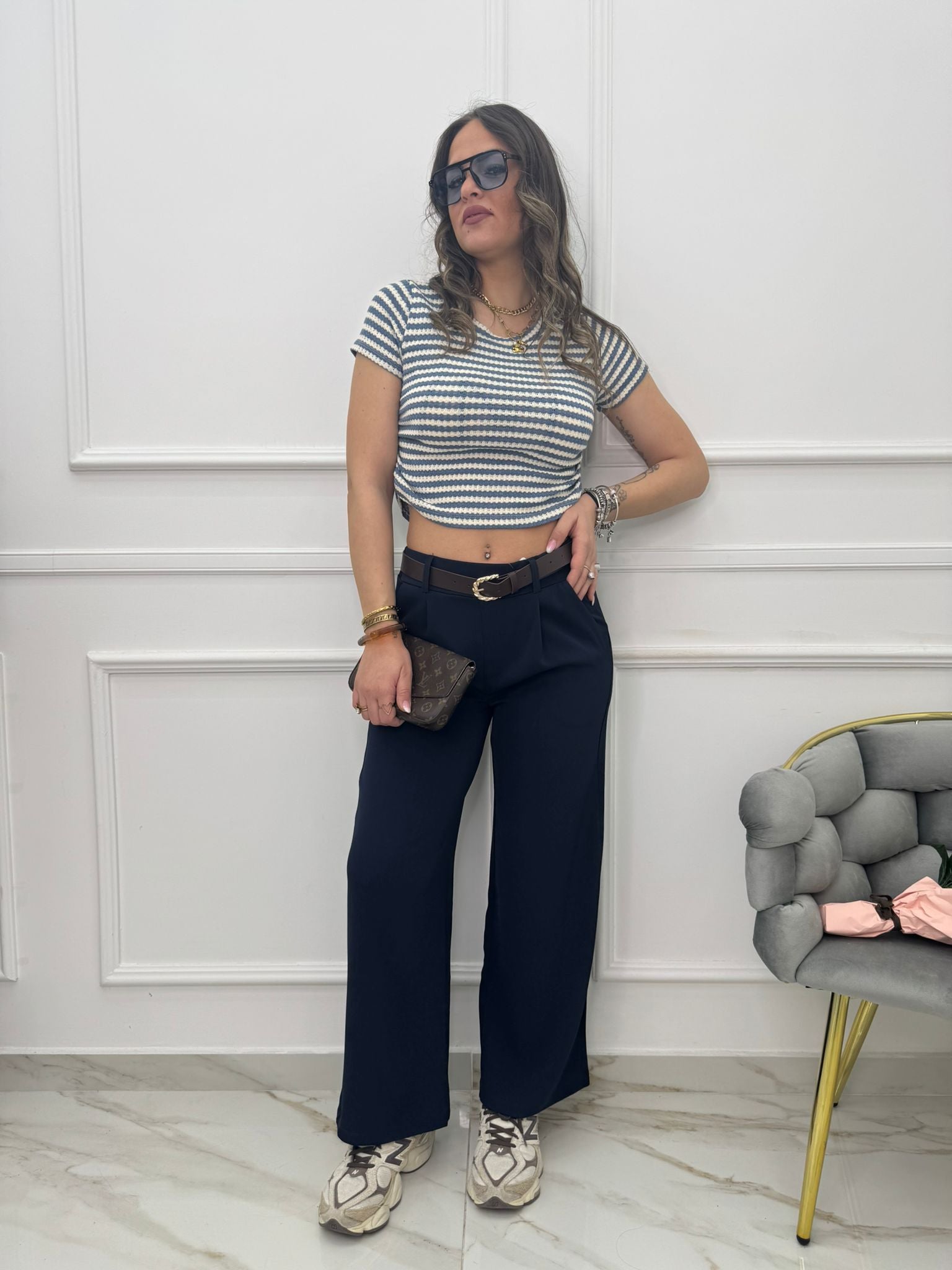 - La modella è una taglia 44, alta 1,79m e indossa la taglia "M/L"