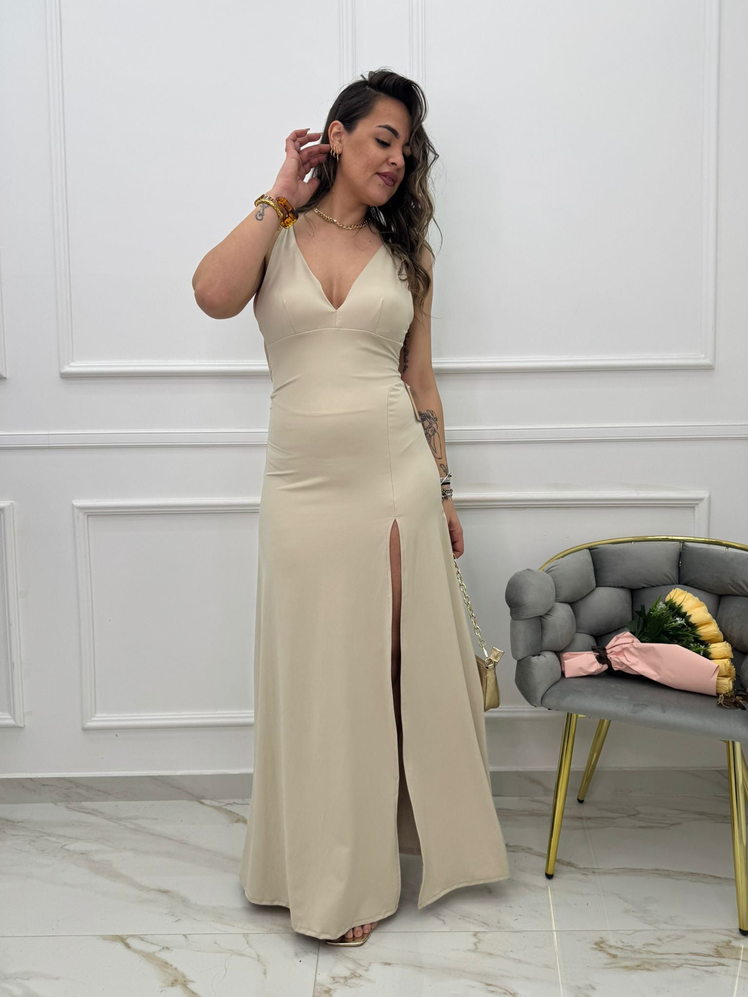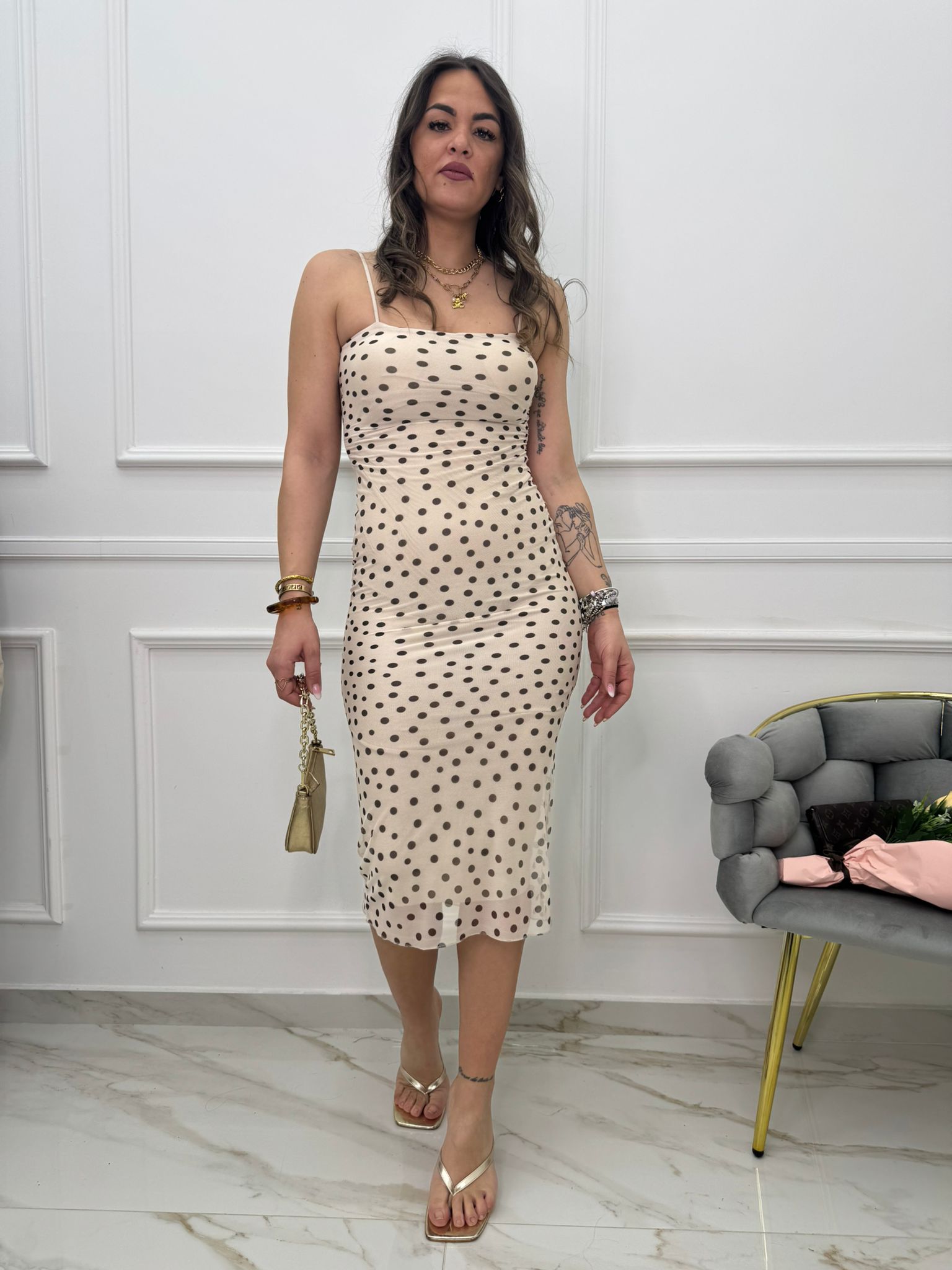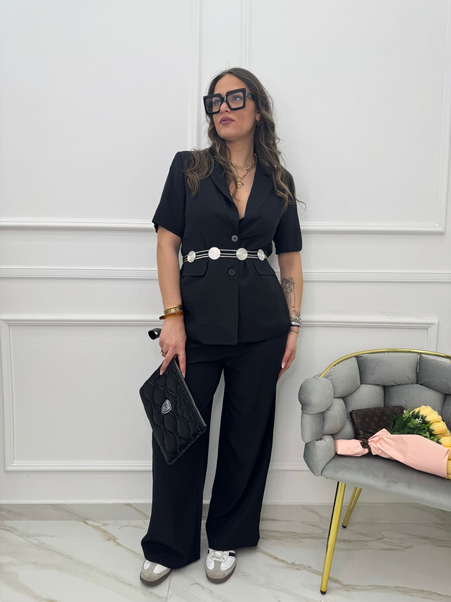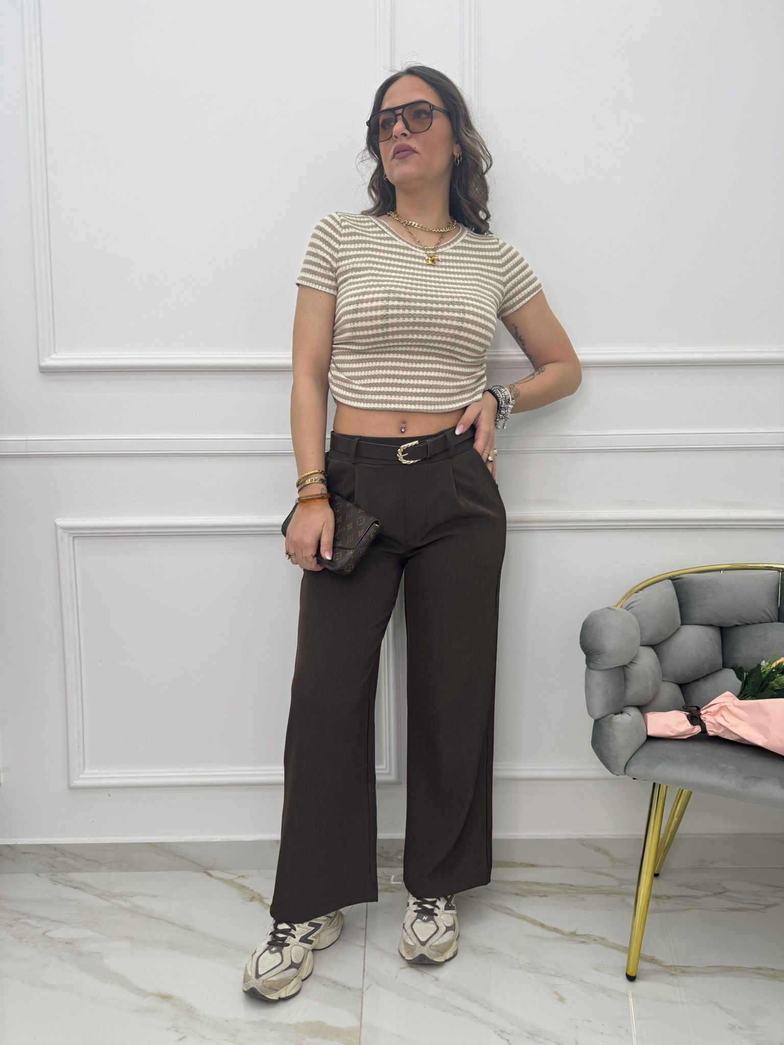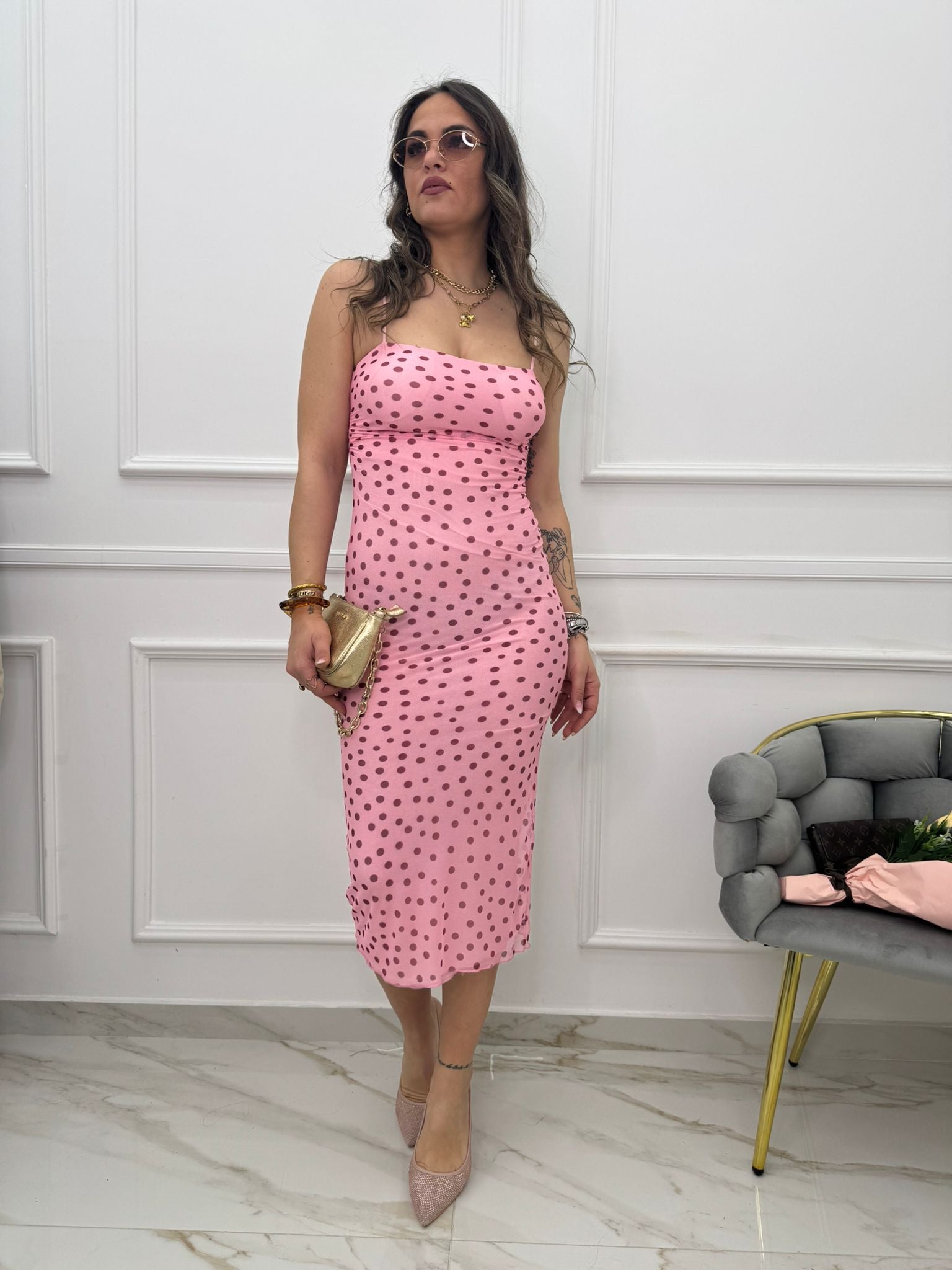 - La modella è una taglia 44, alta 1,79m e indossa la taglia "M/L"