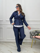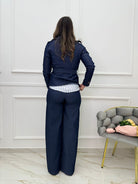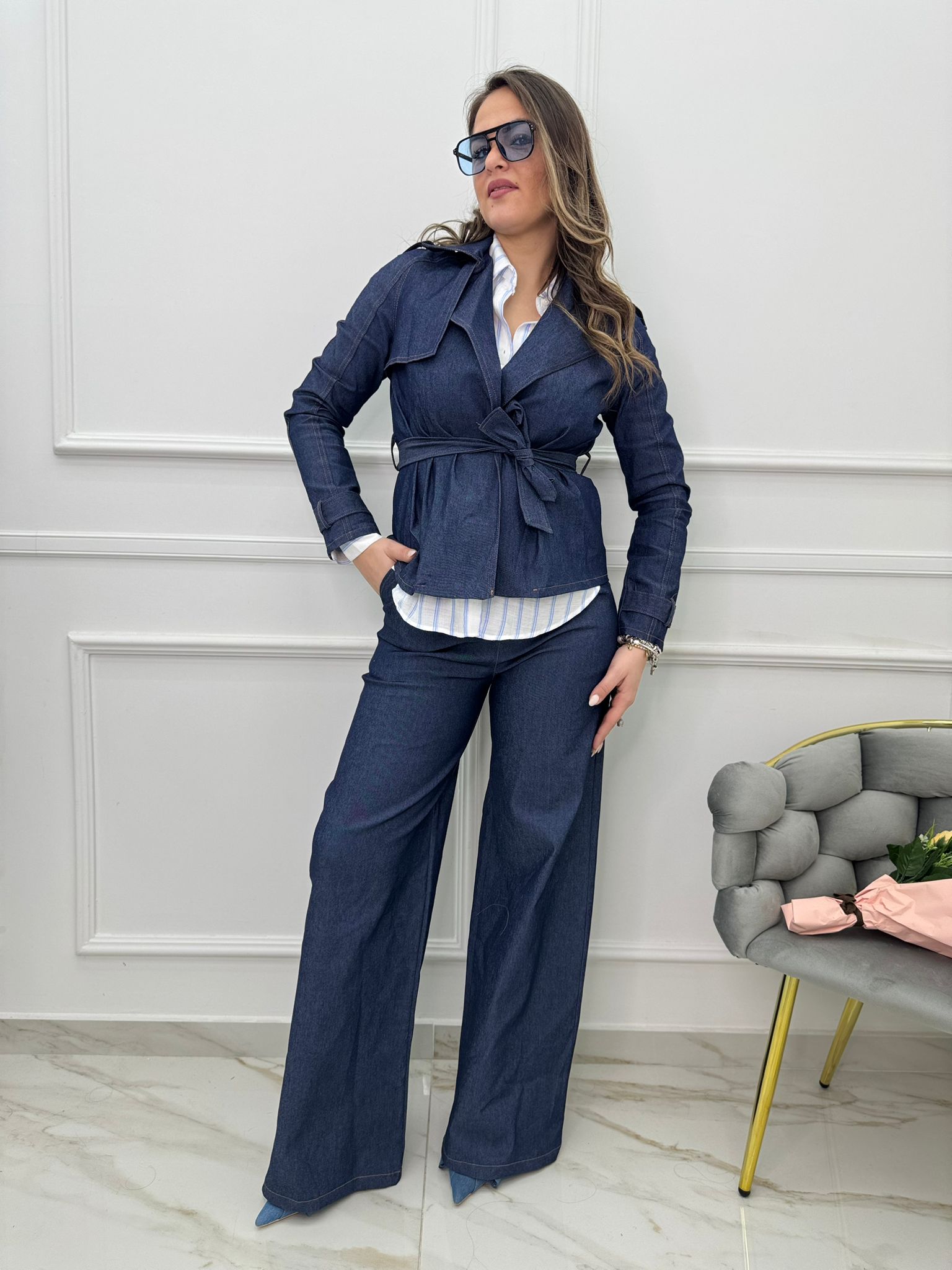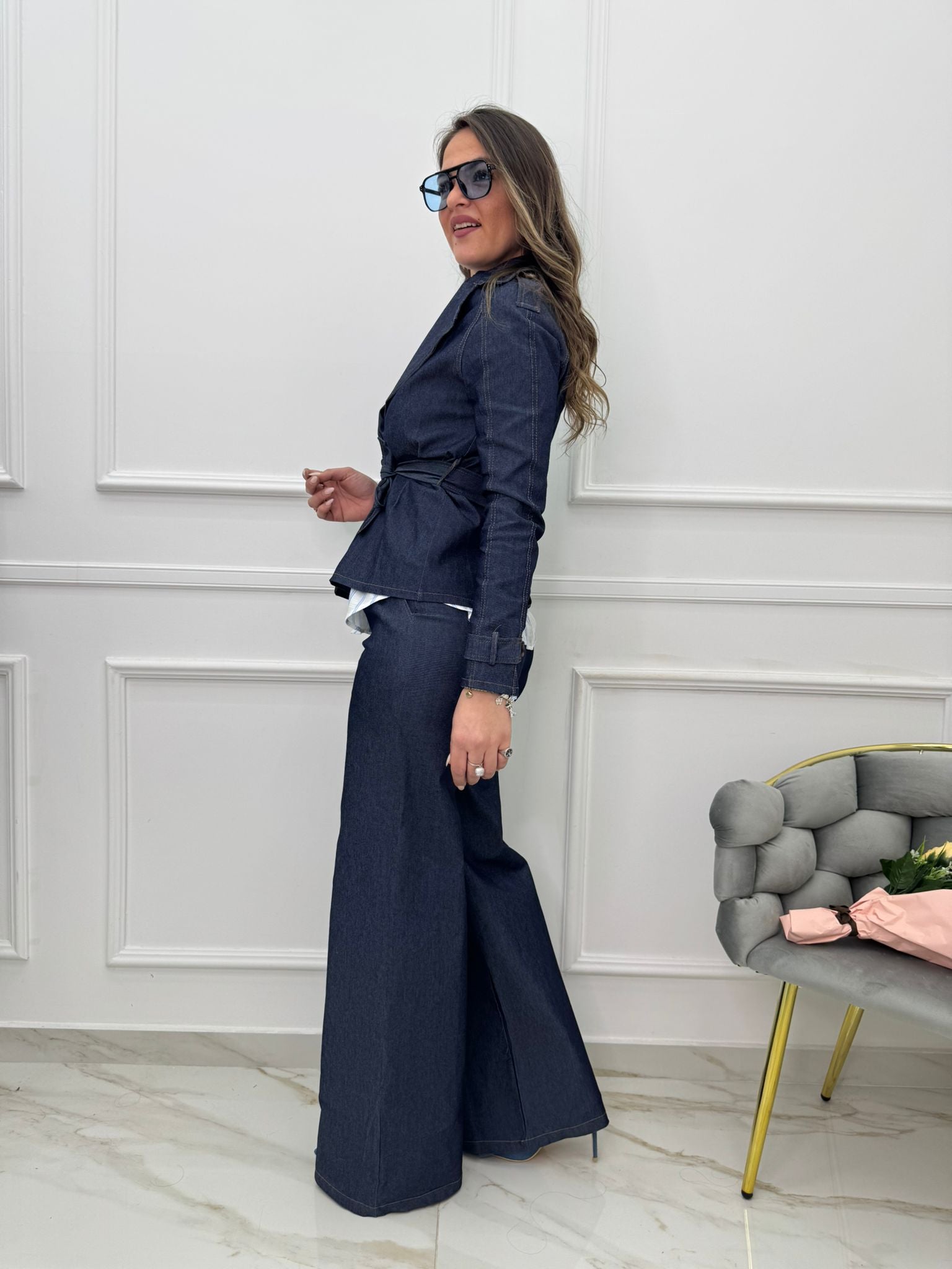 Coordinato denim 2 pezzi con pantalone palazzo e giubbino con cintura