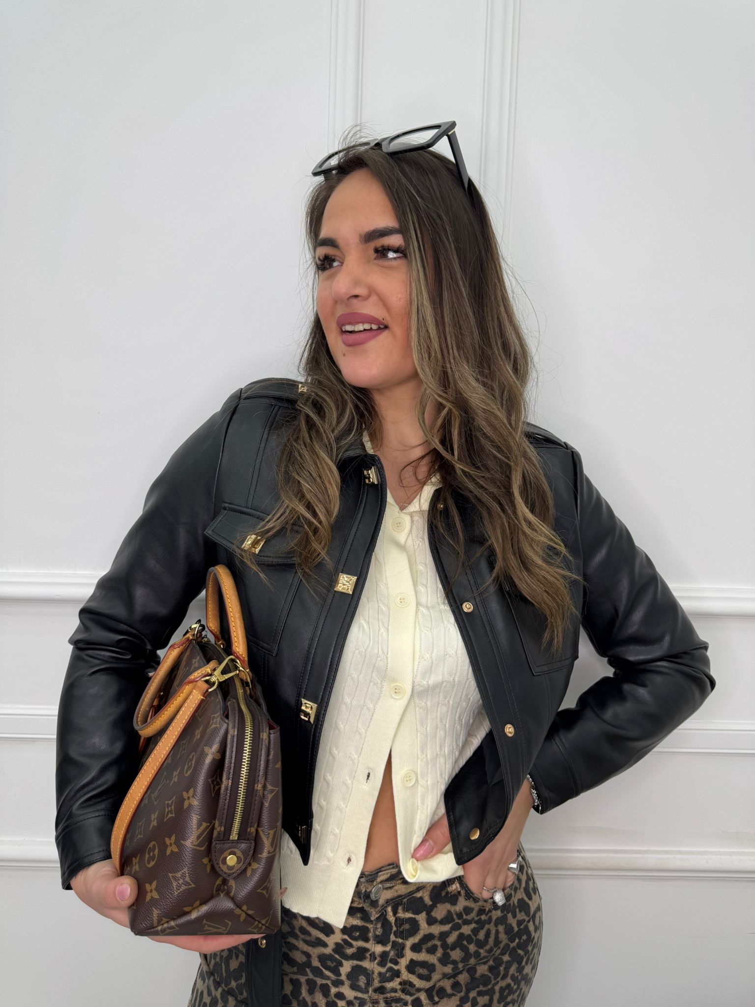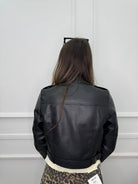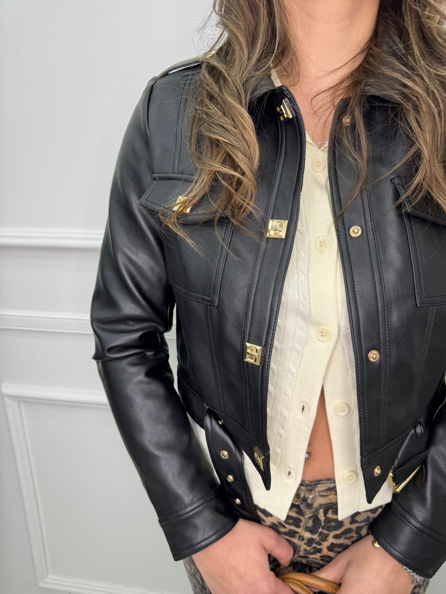 Giubbino eco pelle nero con bottoni oro e cintura in vita