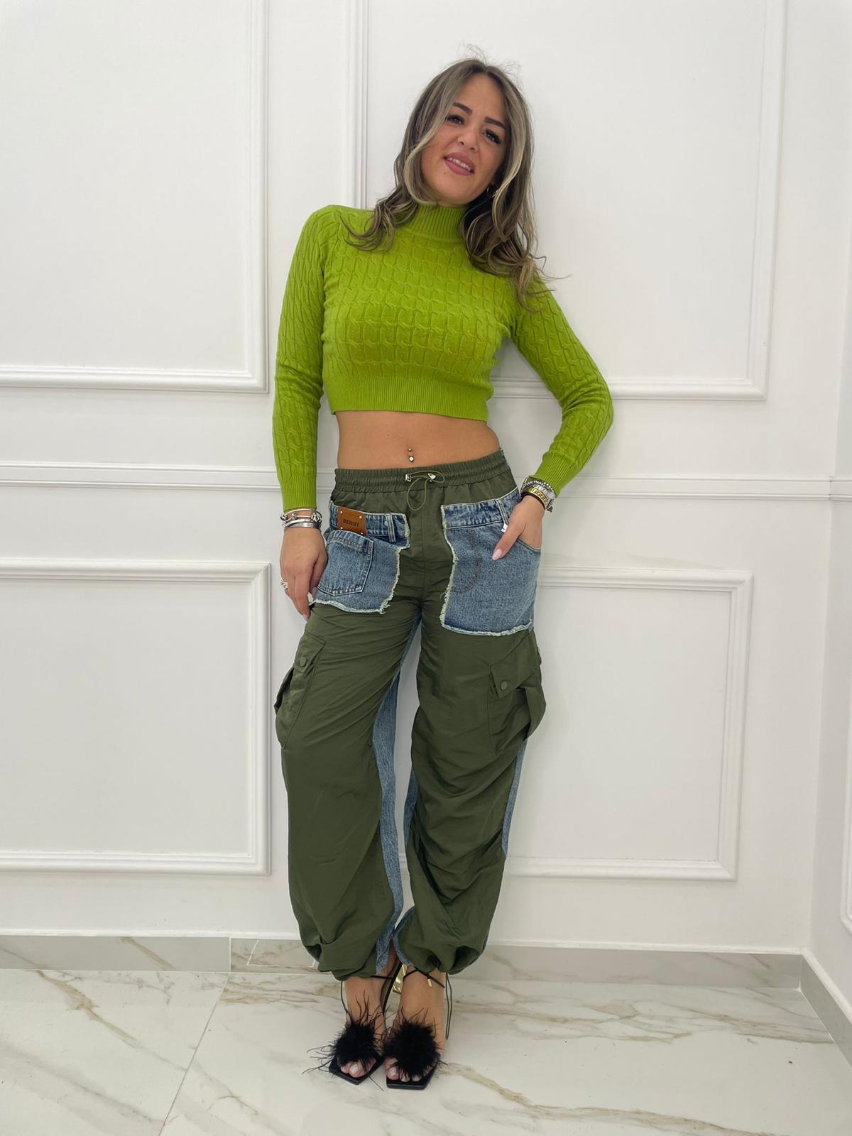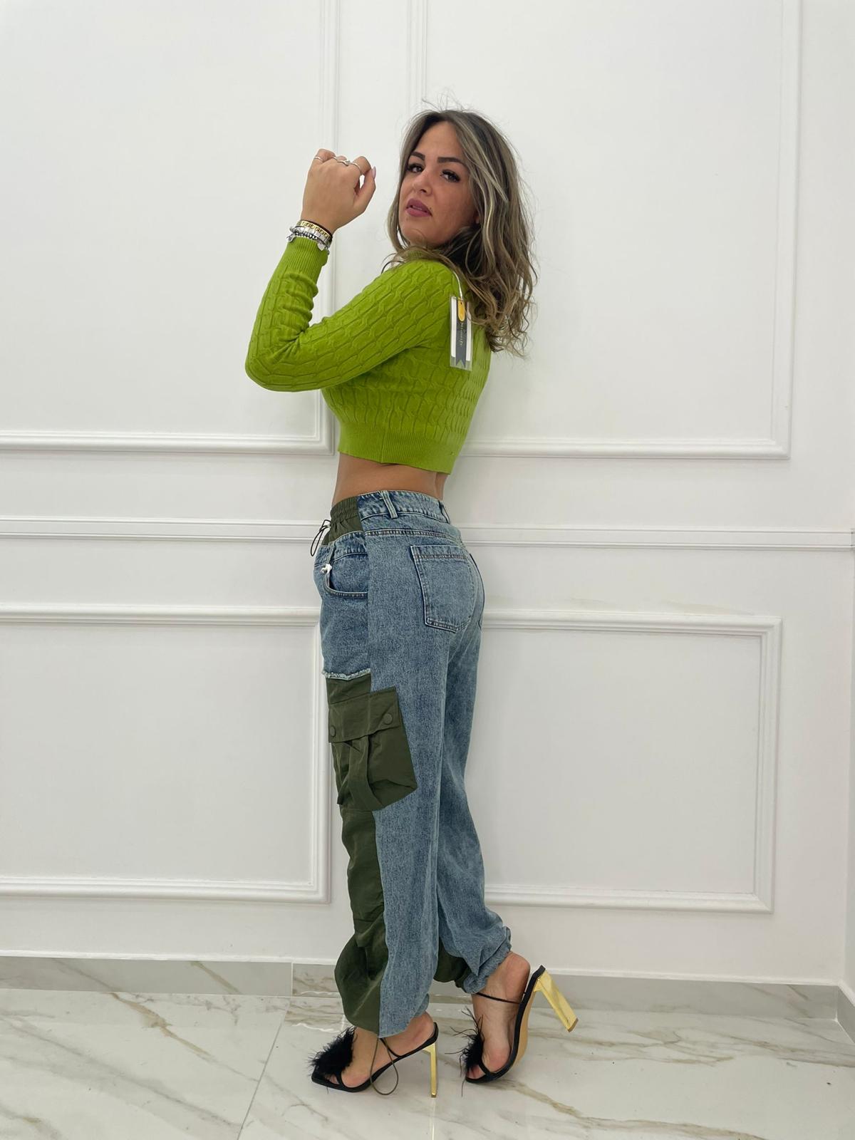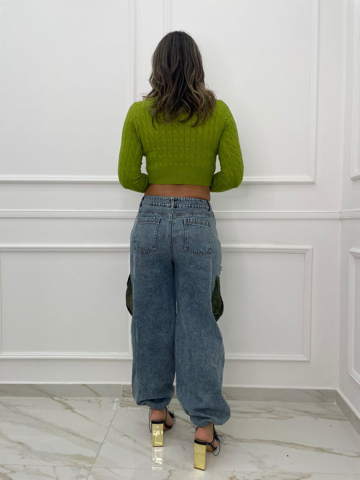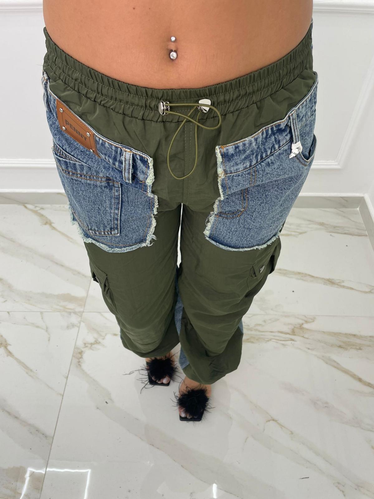 Jeans palazzo cargo con parti in tessuto
